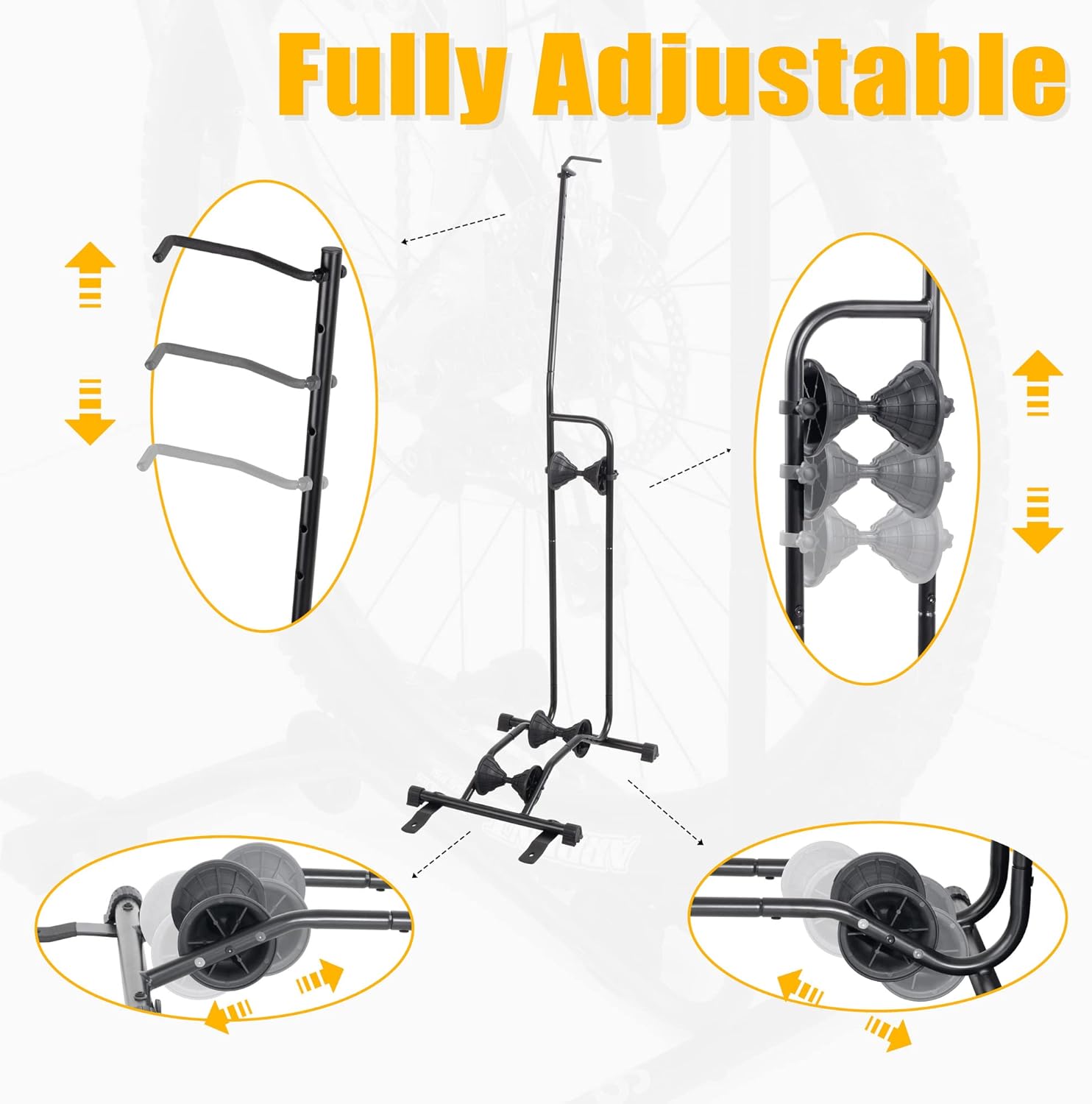 - KEEP YOUR BIKE STEADY & SAFE - Holds your bike firmly and securely with our sturdy stand. The fully adjustable three rollers and hook can accommodate bikes of various sizes, securing them in place without any wobbling. The innovative pulley system allows for easy vertical or horizontal parking, while the rubberized feet provide extra stability and even allow for floor mounting if needed. (Mounting bolts NOT INCLUDED)