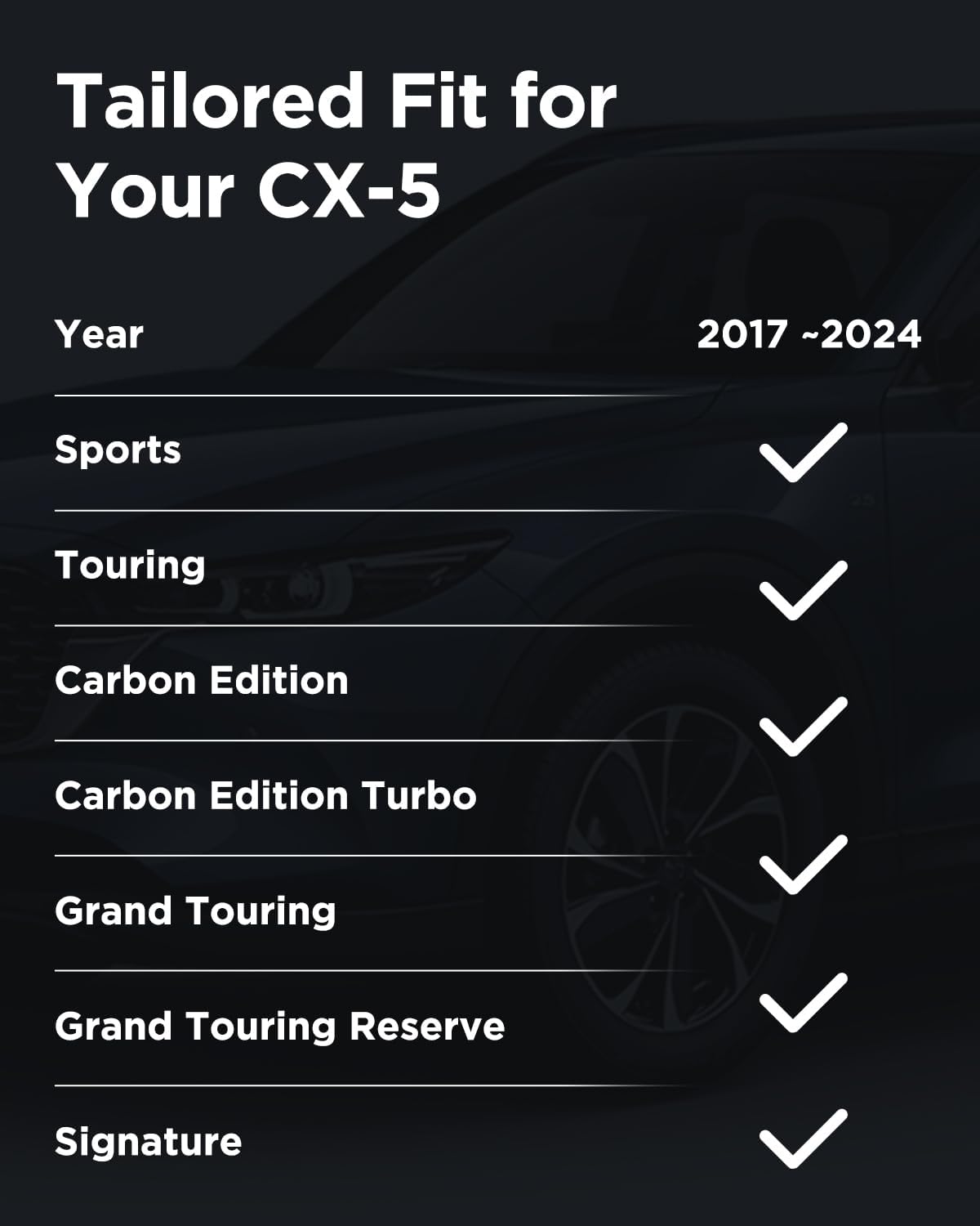 - Seamless Fit for CX-5: Our accessories for CX5 fit 2017 through 2025 models for maximum coverage and a custom fit, protecting Sports, Touring, Carbon Edition, Carbon Edition Turbo, Grand Touring, Grand Touring Reserve, Signature trims in both FWD and AWD configuration