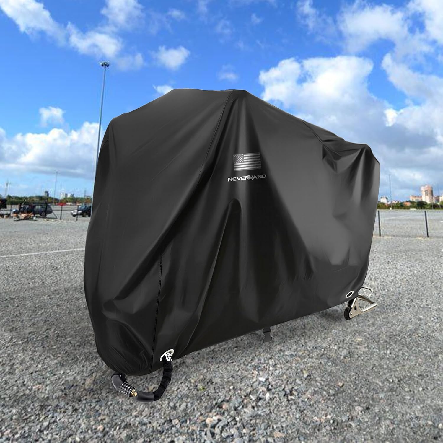 NEVERLAND Motorcycle Cover Waterproof Outdoor - Black Heavy Duty Scooter Cover, Motorbike Cover with Refletive Logo, Lock-Hole, Bandage, Storage Bag-Protect Against Dust, Debris, Rain (XXXL)