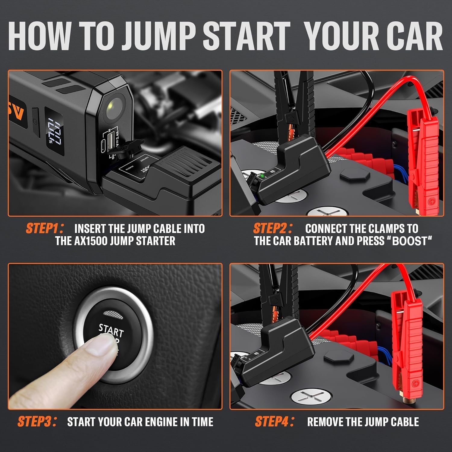 - ă10 Upgrade Protectionsă: AX1500 battery jump starter has 10 different safety features, , frees your worries of misuse and sparks. The zero voltage start function is a safety protection technology by the AX1500 jump starter, Even if the battery voltage is too low (below 0V), pressing the âBOOSTâ button will force the car to restart.