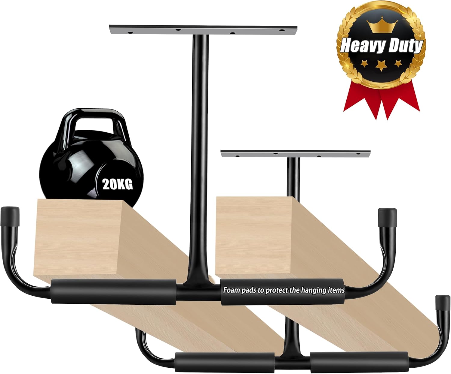 - Safe and Reliable: The double arm ceiling hook is padded with EVA foam and black ‎Powder Coated finish of protection against rust and corrosion, ensuring the longevity of the hook and the safety of your stored items.