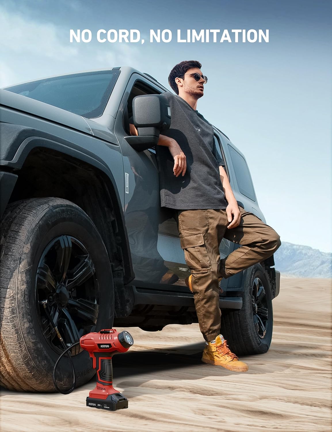 AstroAI C2 Cordless Tire Inflator Air Compressor 20V Rechargeable Battery Powered 160PSI Portable Air Pump with 12V Car Power Adapter Digital Pressure Gauge for Cars Motorcycles JY16P160-18 Red