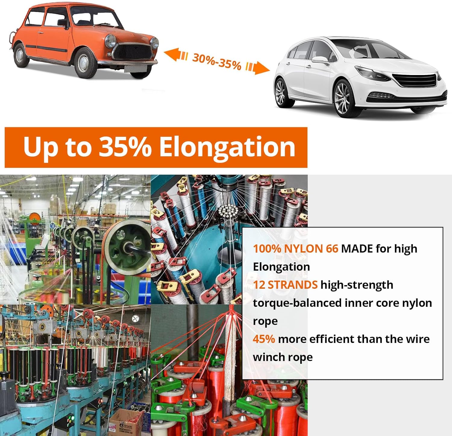 - 【Elastic Elongation Up to 35%】Made of 100% premium nylon 66 for extended durability,12-strand high-strength torque-balanced nylon as the inner core of the rope, better resilience and highly wear resistance, stronger and longer lifespan than other 8-strand recovery tow ropes.Elastic elongation up to 30%-35%,this ultimate recovery rope allows for the safest and smoothest recovery and towing of vehicles stuck in mud, sand or snow without transmitting impact, ensuring nothing is left on your vehicle