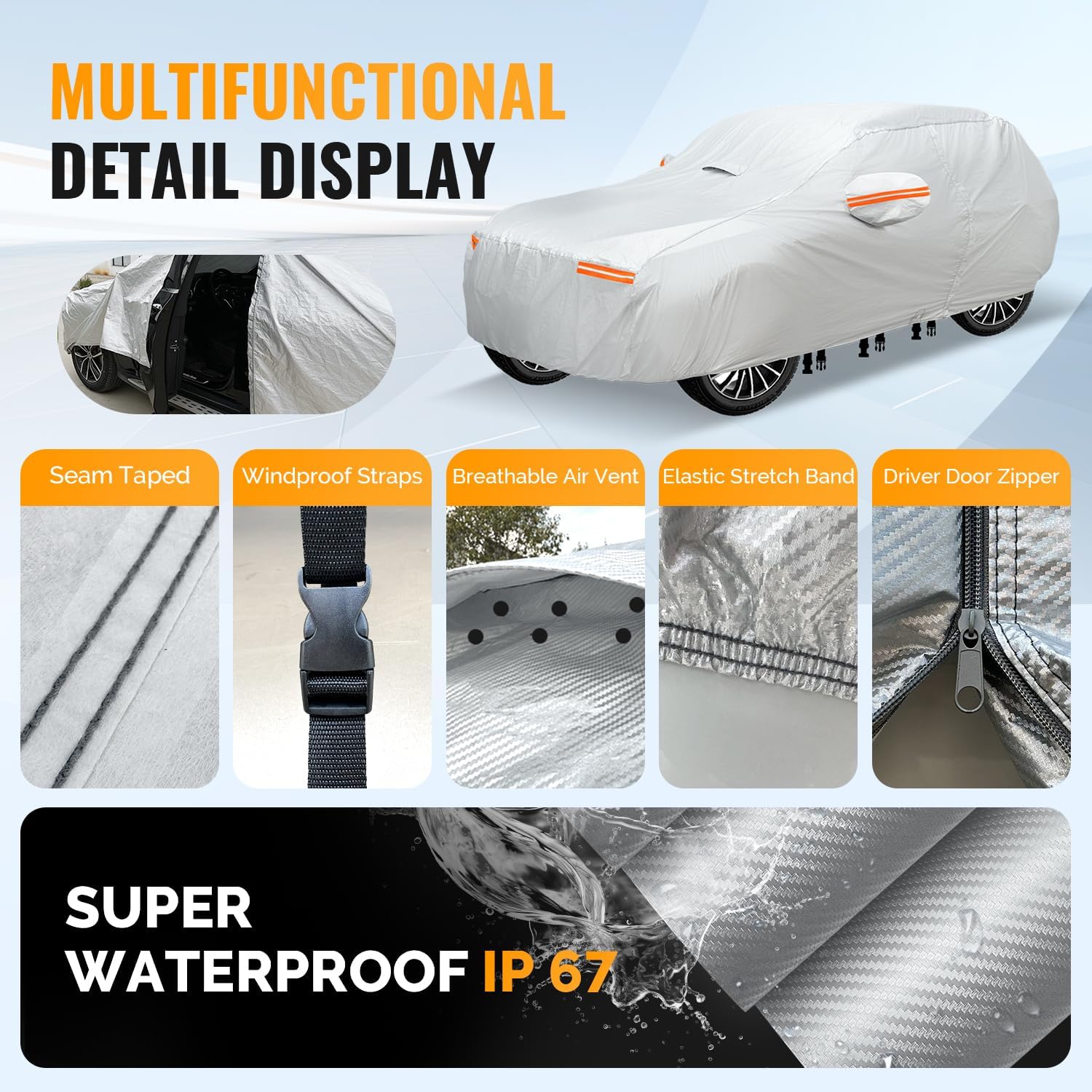 - The car cover is equipped with 3 windproof straps strategically placed around the cover for enhanced stability during strong winds.