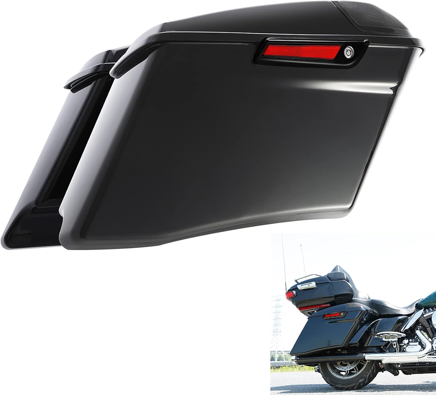 - Saddlebags are stretched 4" longer than stock to cover the muffler front to back and give that stretched look. Cut outs for 5" x 7" Speakers