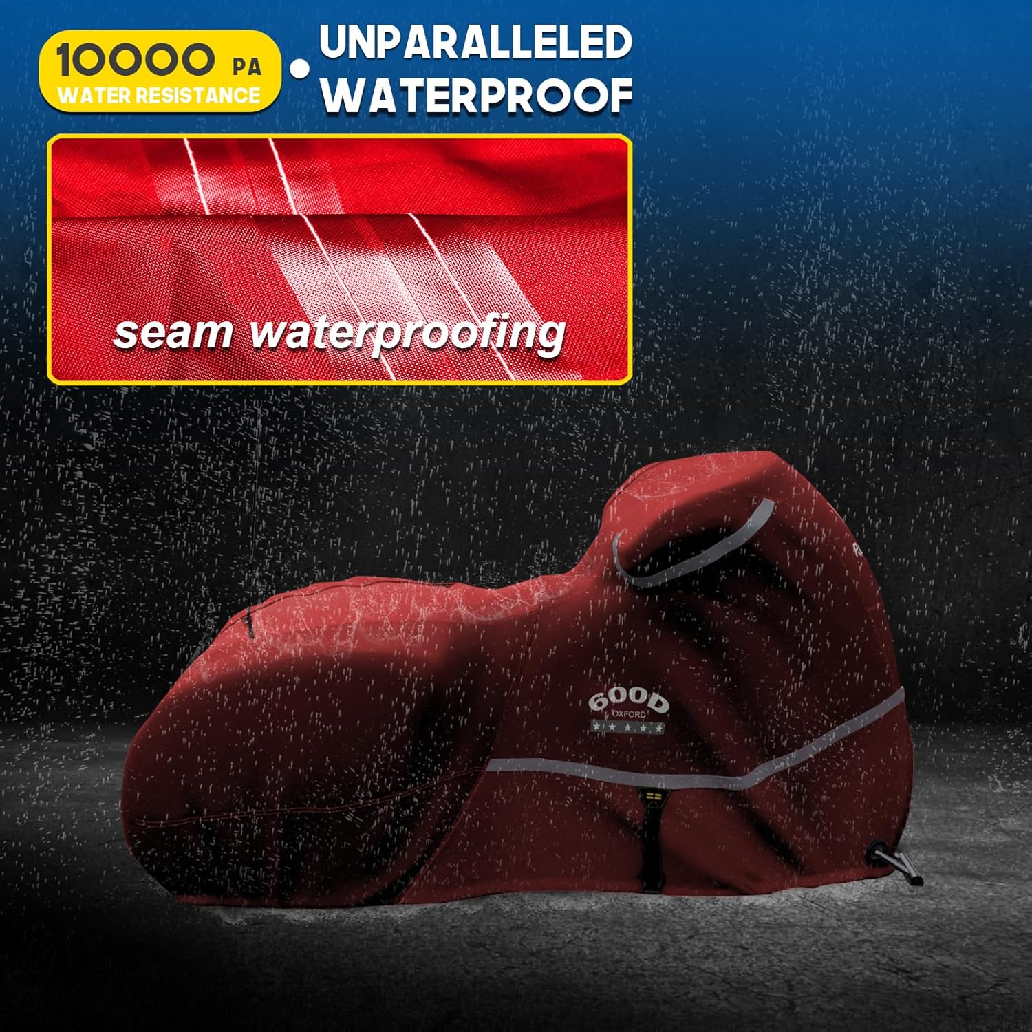 - đ”ă100% 600D Oxford clothă: The motorcycle cover, weighing 5.4lb, is almost thicker and solider than those on the market. The fabric is resistant to aging and ripping, and UV proof, dustproof and rainproof.
