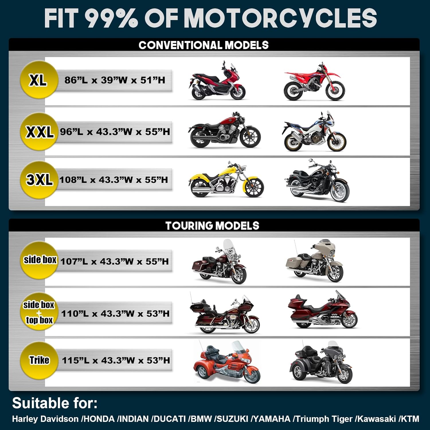 - đ”ă3D CUTăThis cover is designed for motorcycle models with side boxes.SIZE: 107"L * 43"W * 55"H,Suitable for most motorcycle of touring models,such as Harley Davidson ,HONDA,INDIAN,DUCATI,BMW,SUZUKI,Triumph Tiger,KTM,YAMAHA,KAWASAKI.