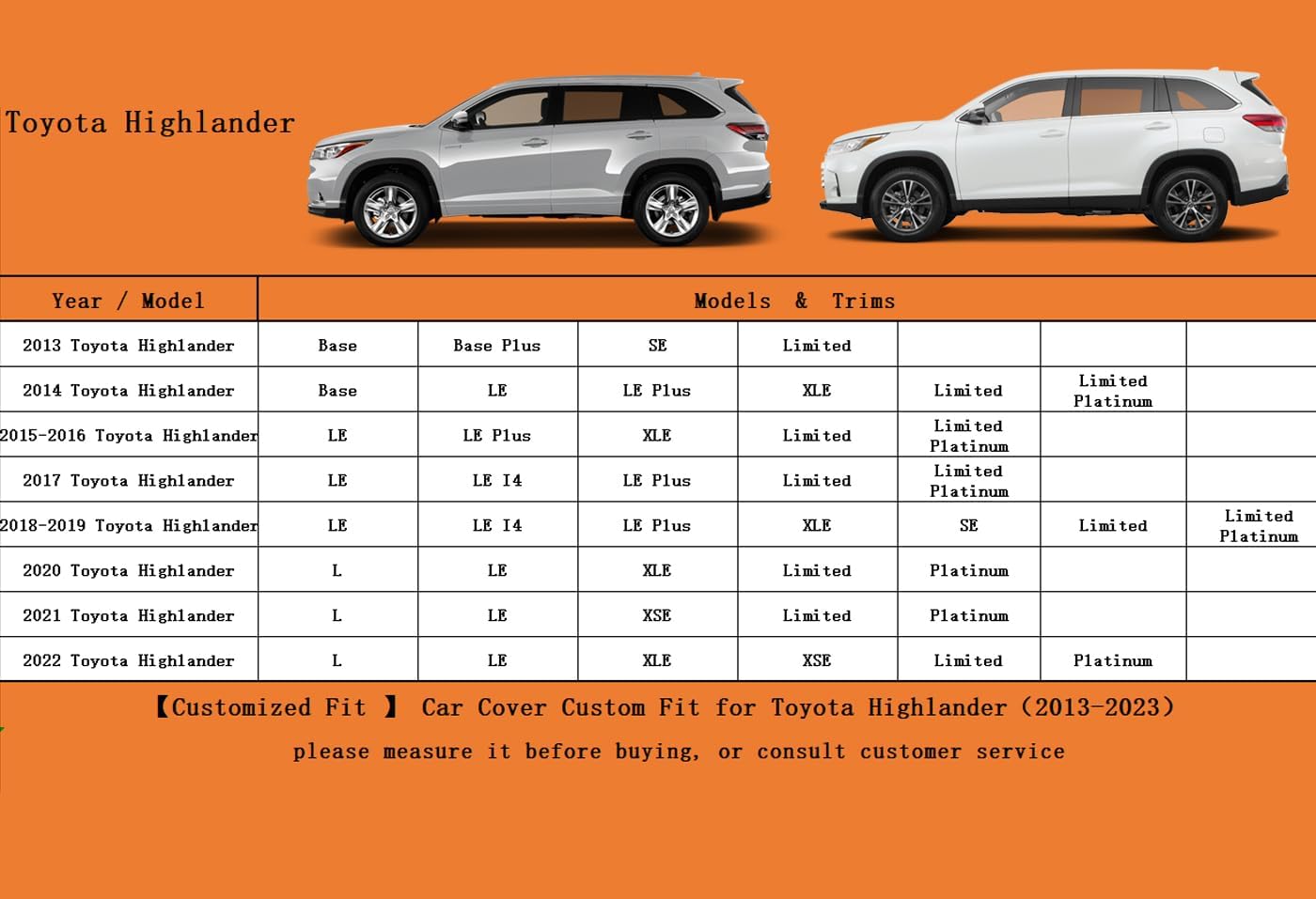 - ăSuitable forăâ Custom fit for Toyota Highlander (2013-2025). Come with a large enough portable bag to store your cover when you do not use