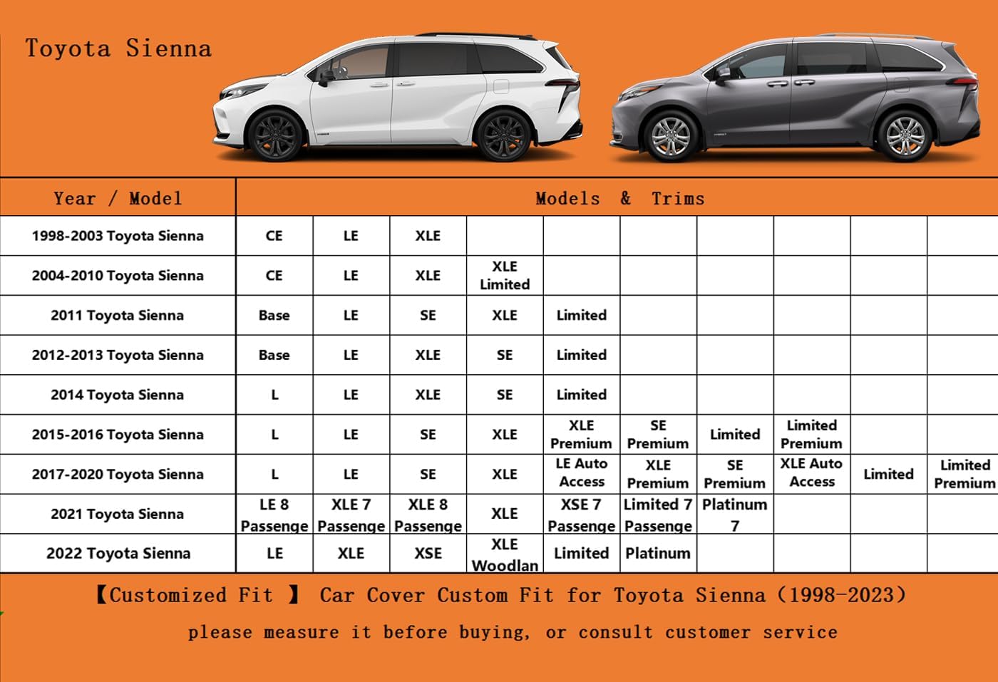 - ăSuitable forăâ Custom fit for Toyota Sienna (1997-2025). Come with a large enough portable bag to store your cover when you do not use