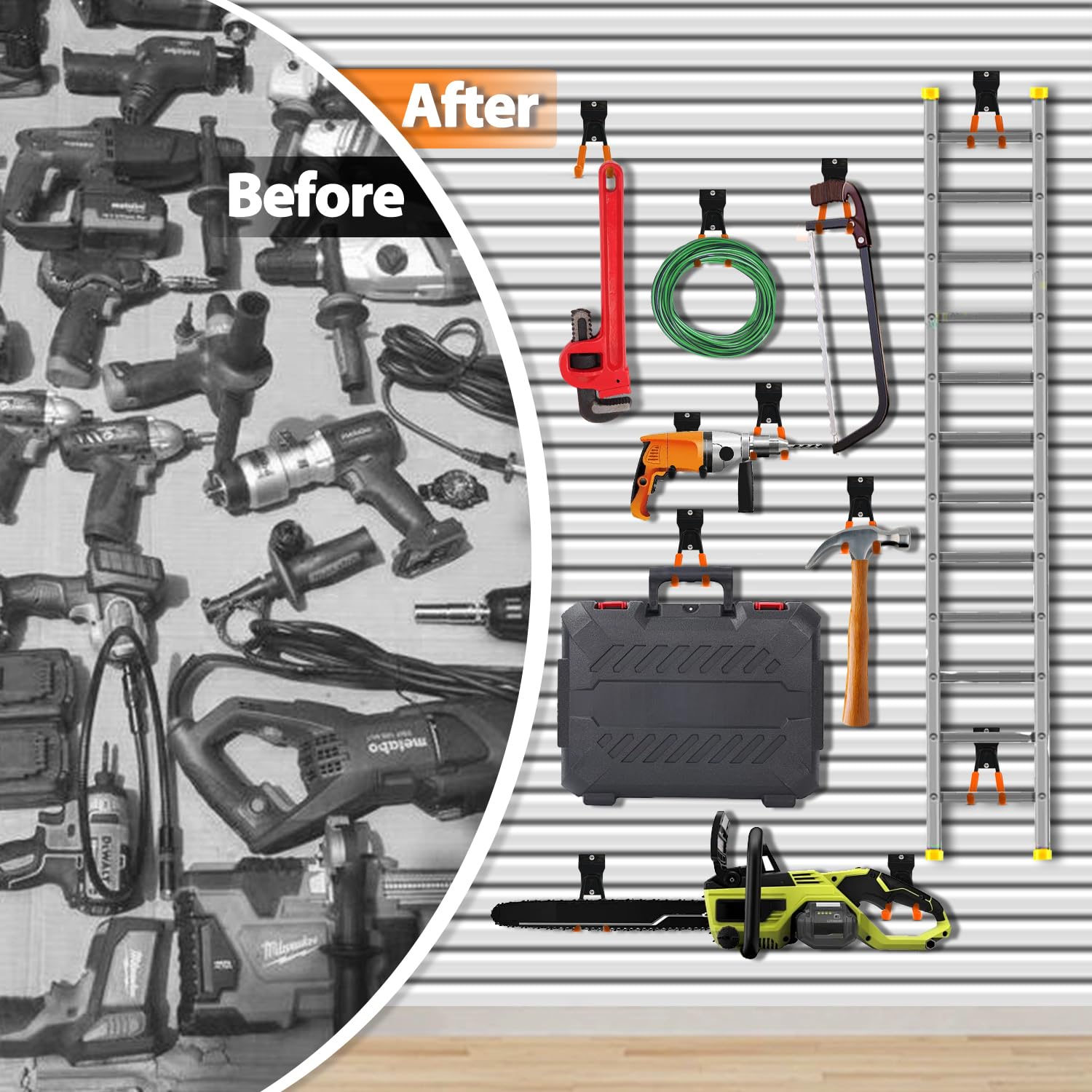 - Easy to Install and Space Saving: Slat wall hanging hooks fit standard slat wall like Proslat, Handiwall, Crownwall, etc., you can directly place storage hooks to both sides of the panel groove, fix garage hooks for hanging into the groove on the slatwall panel then press slat wall hanging hooks down then the wall hooks will fit the slat wall perfectly. Then you can move slat wall accessory to anywhere you want,saving you time and effort