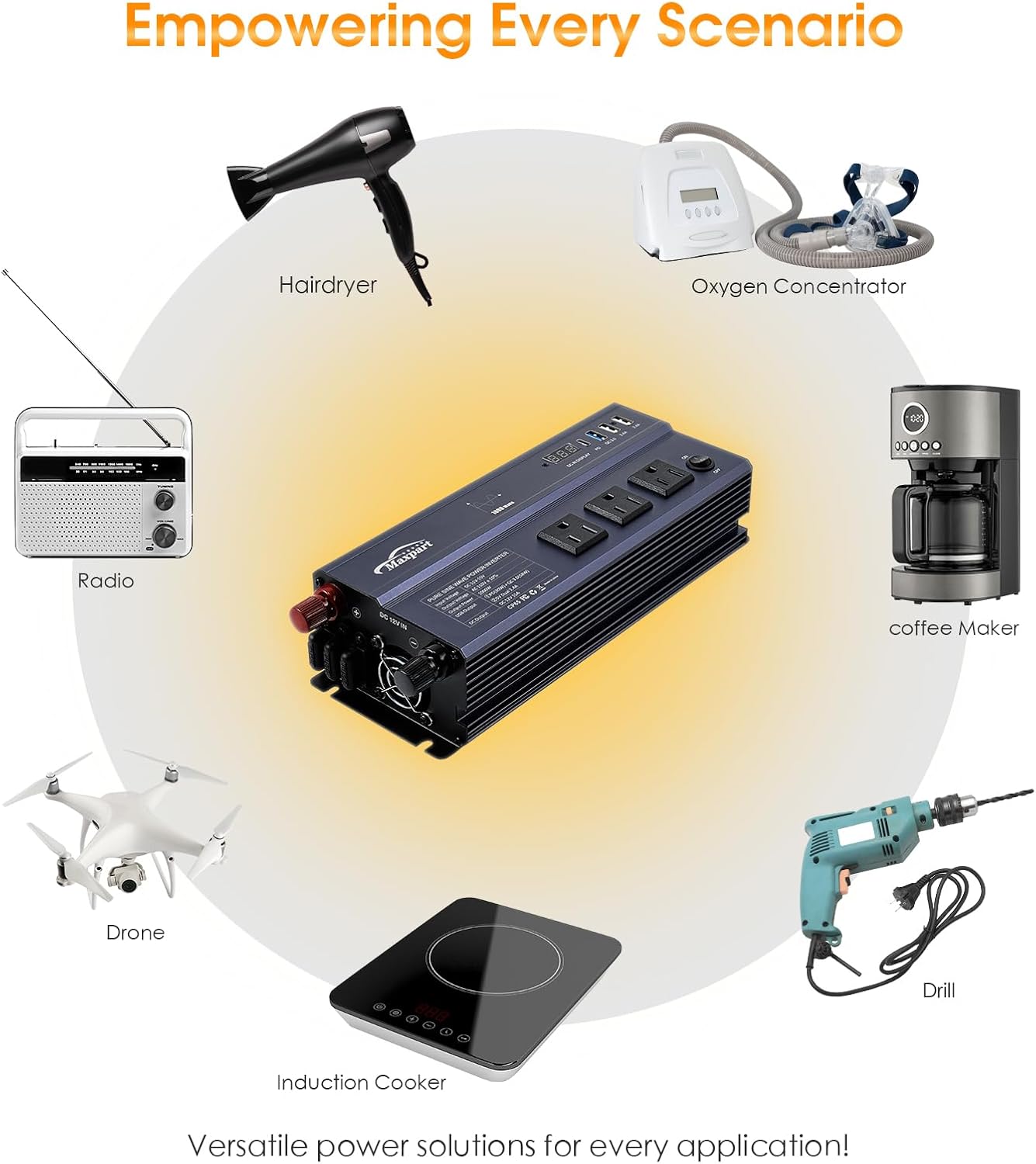 - Reliable Power Inverter: Maxpart pure sine wave inverter is designed to convert DC power from a 12V battery into AC power that can be used to run various devices. With its pure sine wave output, the power converter can power PFC, resistive devices, capacitive devices, and inductive devices without causing damage to the product and devices.a LED Display Screen