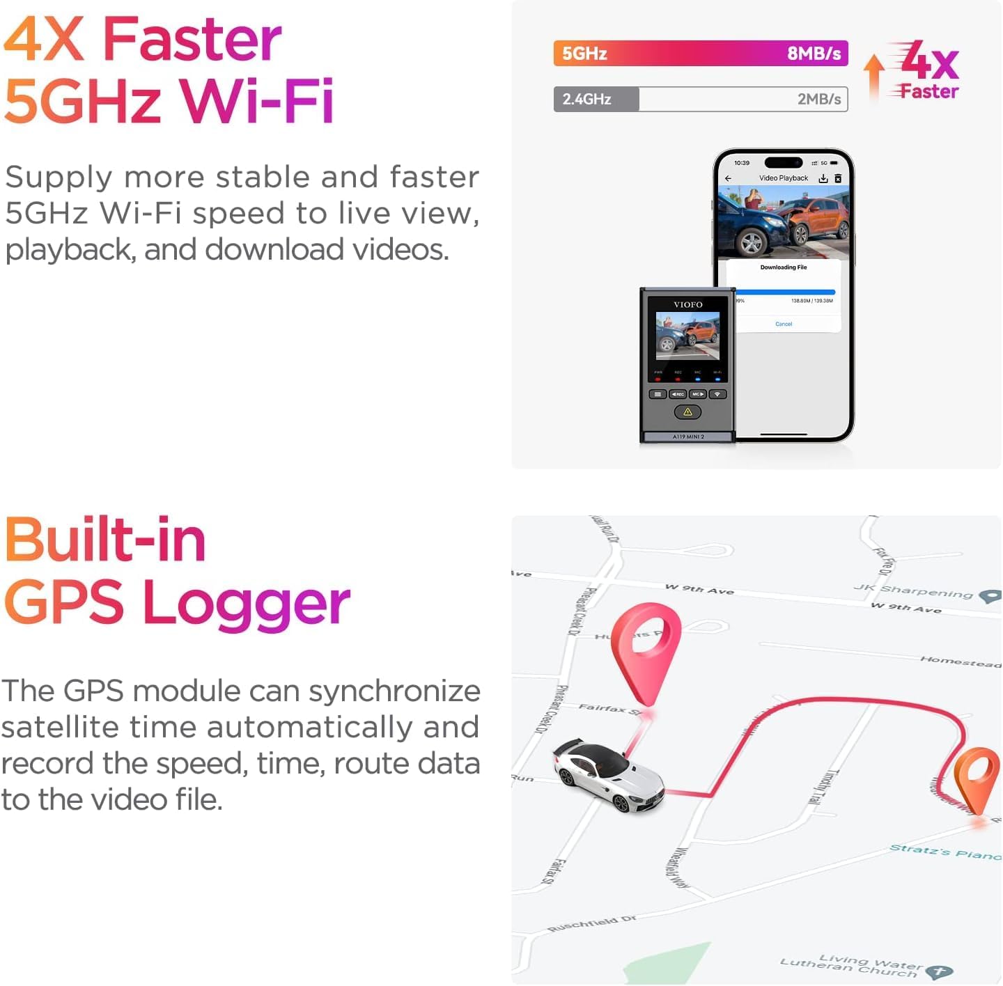 - 【Faster 5GHz Wi-Fi & GPS】VIOFO 2K dash cam A119 Mini 2 supports upgraded 5GHz Wi-Fi to provide 4 times faster file transfer. Connect the dashcam to your iOS & Android phones via the VIOFO app and you can live view, playback, download videos, or adjust settings, making it simple to access, store, and send over video evidence in case of any incident. Built-in GPS module can automatically synchronize satellite time and record driving route, speed, and time data into the video files.