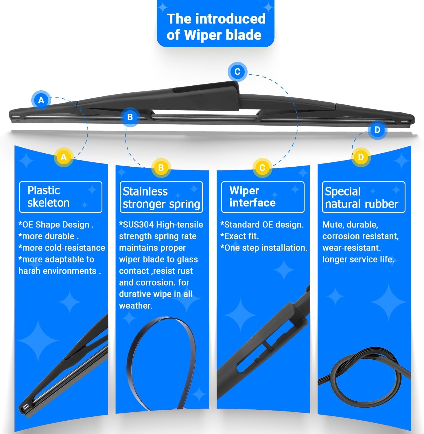 - {WIPER PERFORMANCE}: Natural rubber material making sure the wiping is the best, quiet wiping without judder or squeaking, resistant and a long service life.