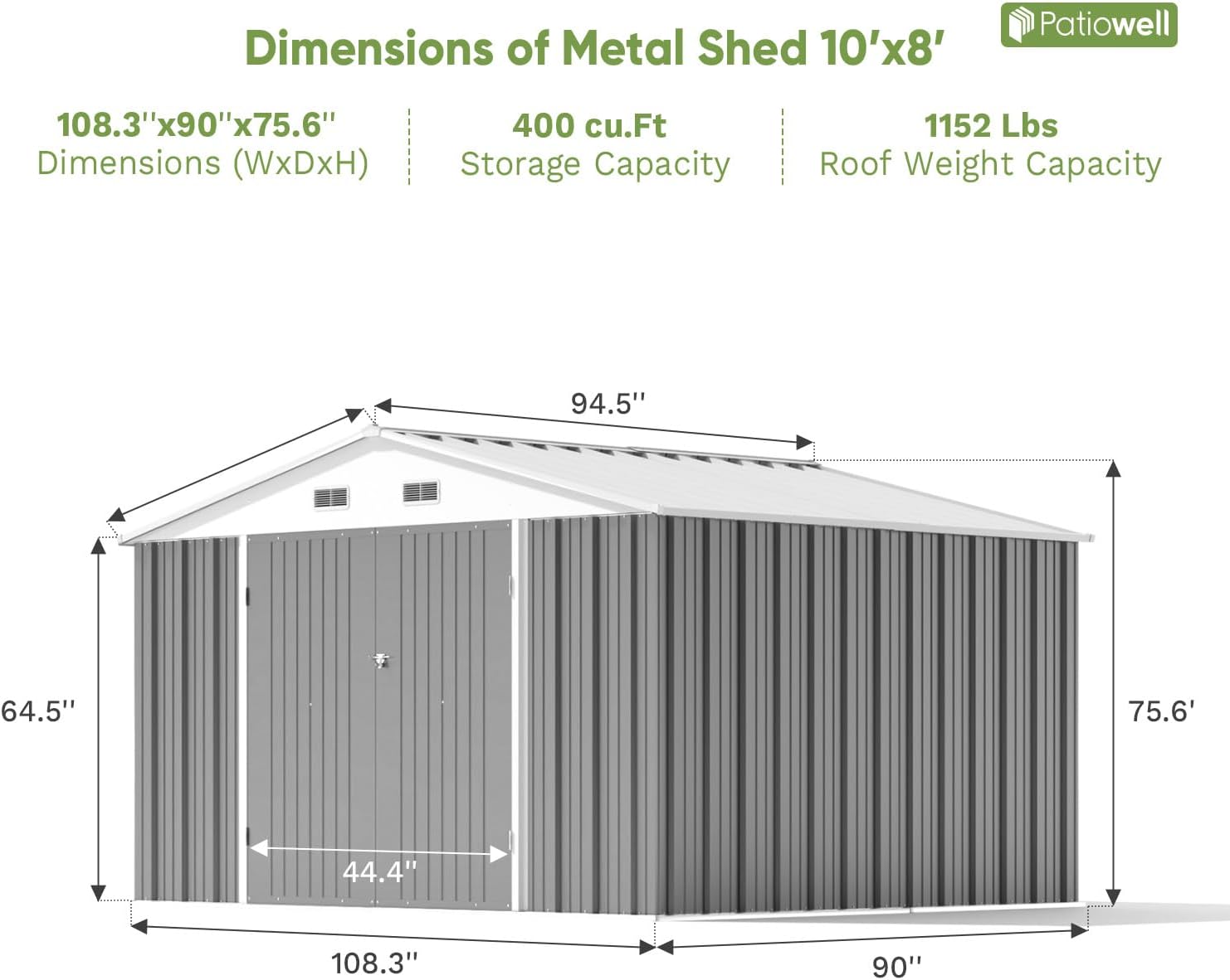 Patiowell 10 x 8 FT Outdoor Storage Shed, Large Garden Tool Metal Shed with Sloping Roof and Double Lockable Door, Outdoor Shed for Backyard Garden Patio Lawn,Grey