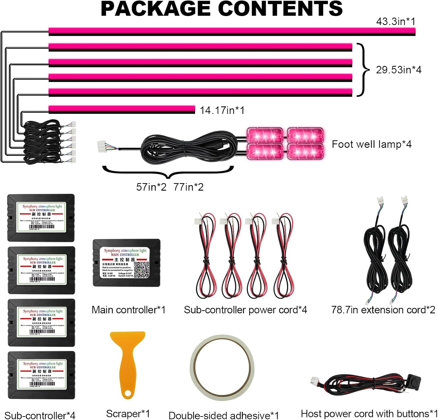 - đźššCar Ambient Light Design: AMKI car led lights includes 6 acrylic fiber optic light strip(4*29.5inch+1*43.3inch+1*14inch), and 4 car interior foot well lights(51inch*2/66inch*2), one master controller and 4 sub controller,all required installation tools are included, easy to install.Just put the fiber optic light strip into the gap in the car, hidden the line of car foot light under the car mat, without worrying about exposed wiring or an untidy look.
