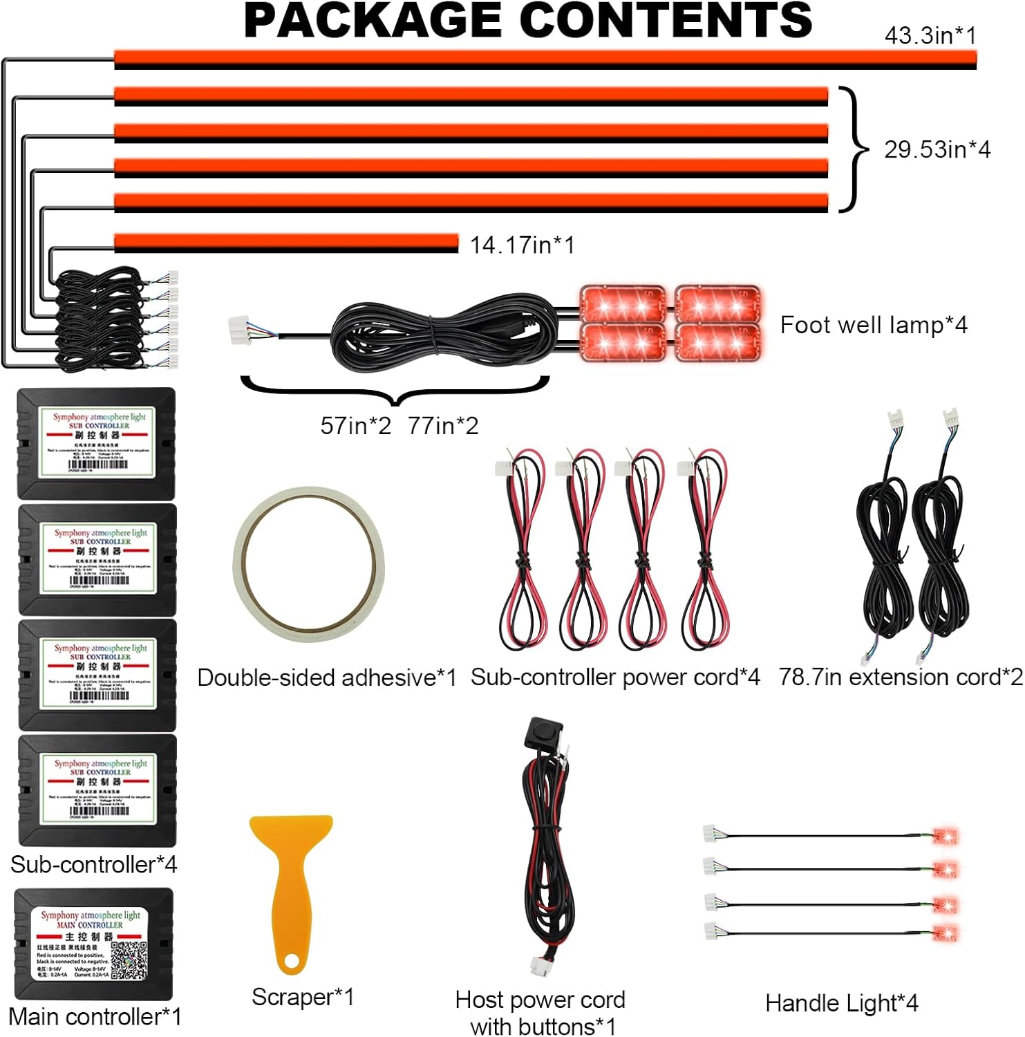 - đźššCar Ambient Light Design: AMKI car led lights includes 6 acrylic fiber optic light strips (1*14inch+4*29.5inch+1*43inch, with 593 LEDs), 4 under dash lights, 4 door handle light, one master controller and 4 slave controller, all required installation tools are included, easy to install,without worrying about exposed wiring or an untidy look.