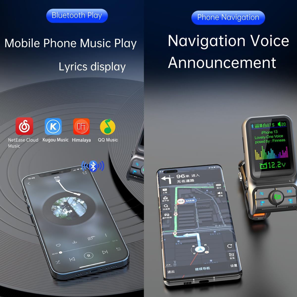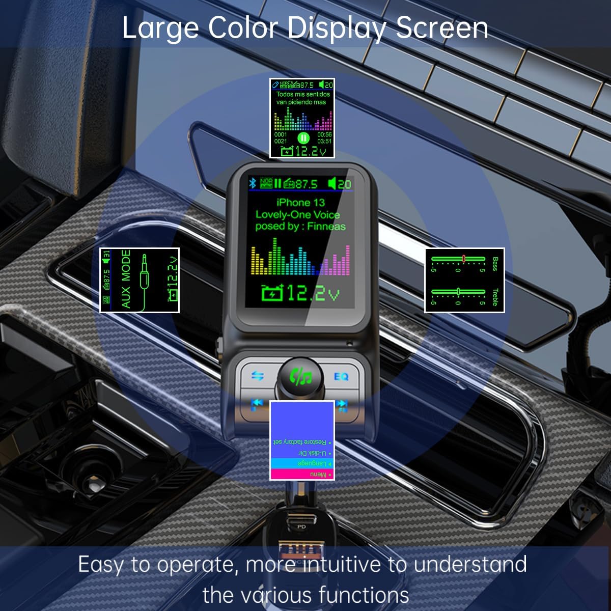 - The 1.8-inch color display provides a wider visual interface with a clear view of incoming phone numbers, music names, song lyrics, music volume, FM frequency, battery voltage, Bluetooth connected devices, and vivid music spectrum information