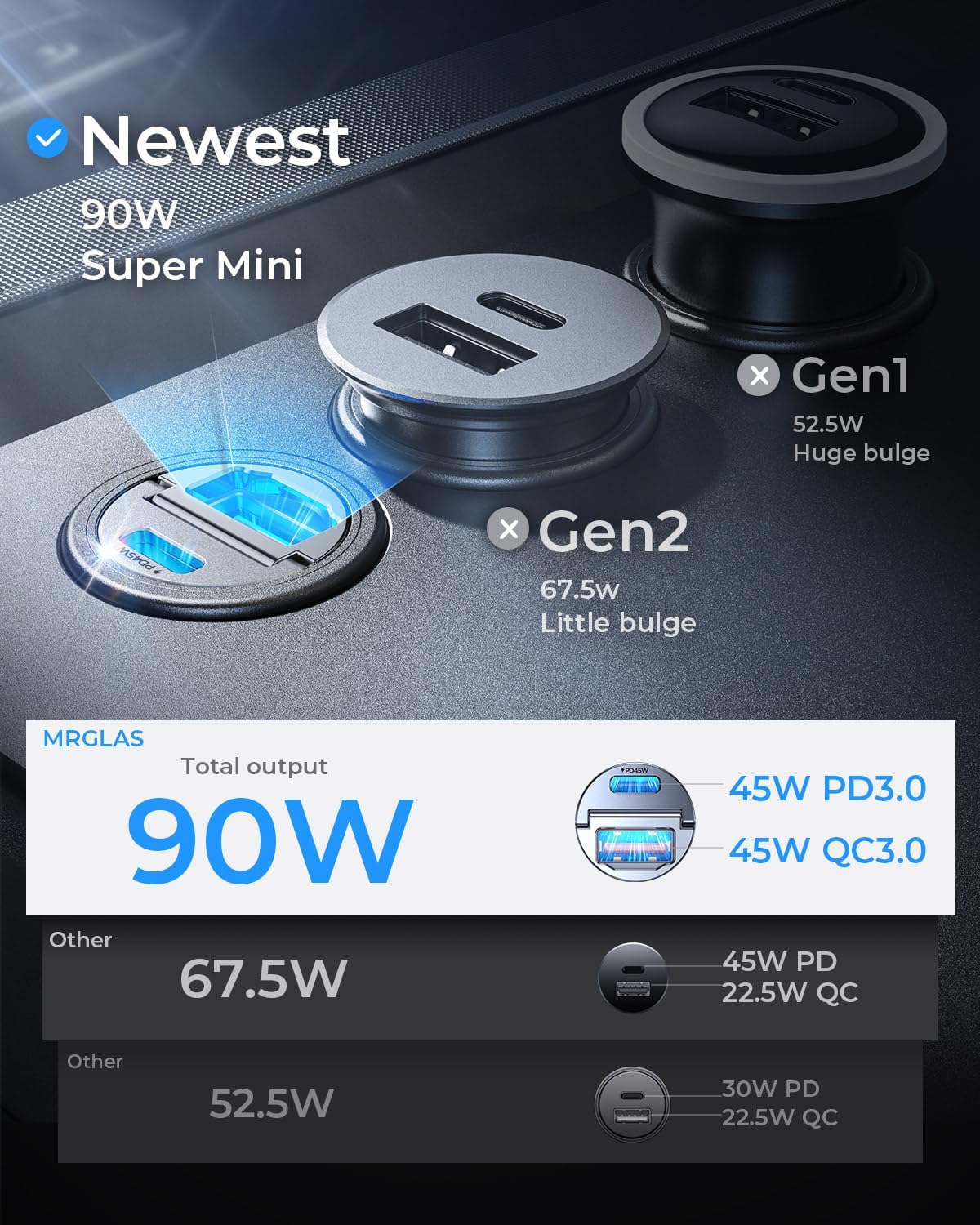 - PD45W+QC45W SUPER FAST CHARGING: MRGLAS 90W car charger adapter fast charging supports PD 45W (USB-C port) and QC 45W (USB-A port) high output, which can fast charge all major mobile phones/tablets at the same time. Allowing iPhone 16 Pro Max and Samsung Galaxy S25 to charge from 0% to 89% in 30 minutes, it helps you save more time on long trips
