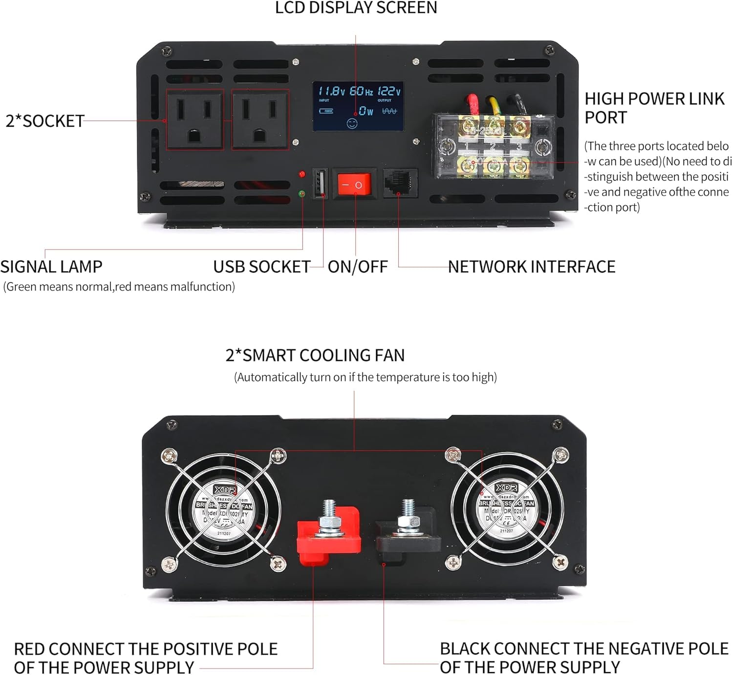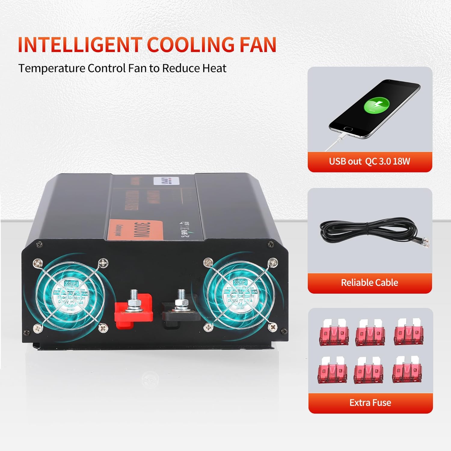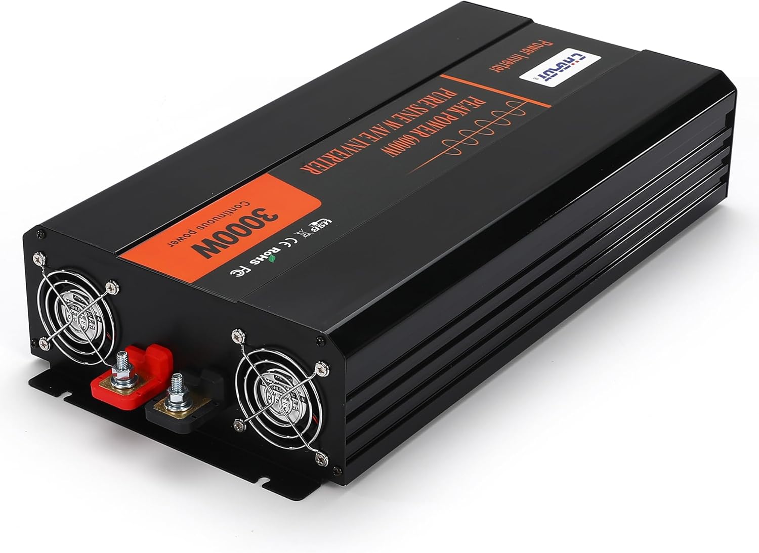 - 💯【3000W Pure Sine Wave Inverter】 High quality pure sine wave inverter, power inverter converts the battery's 12V DC power to 120V AC, provides stable power at 3000W, and peak power is 6000W. Pure sine wave type can avoid wasting energy during transmission. It is ideally suitable for Journeys, Camping, Tents, Boat trips, Working on the way, and everywhere, where is no electricity! Simply connect the Power Inverter to a Battery and then connect to electrical appliances.