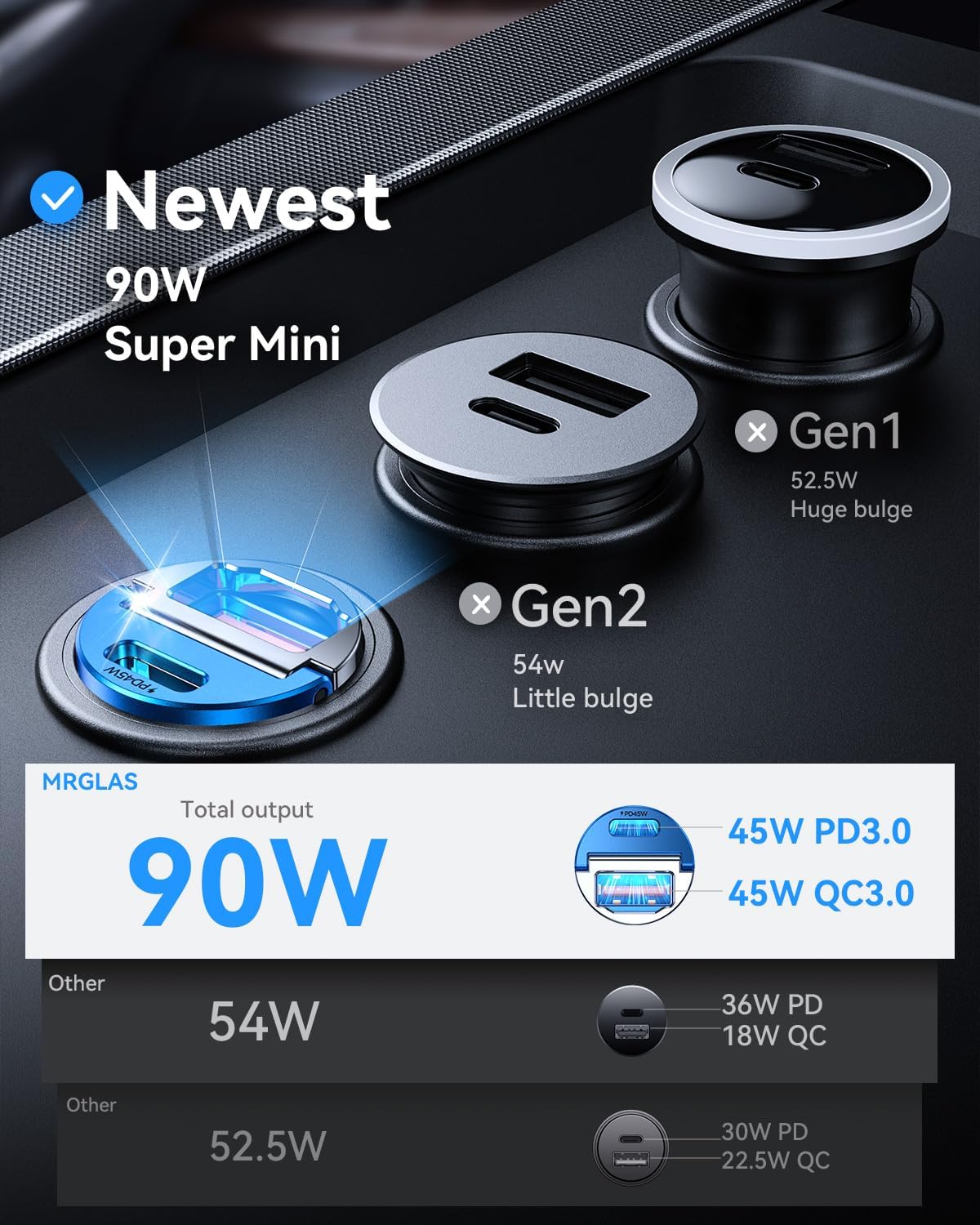 - PD45W+QC45W SUPER FAST CHARGING: MRGLAS 90W car charger adapter fast charging supporting PD 45W(usb-c port) and QC 45W(usb-a port) high output, Can fast charge all prevailing phones/iPad/tablet at the same time. Makes the IPhone 16 Pro Max and Samsung Galaxy S25 charging time from 0% to 89% in 30 minutes
