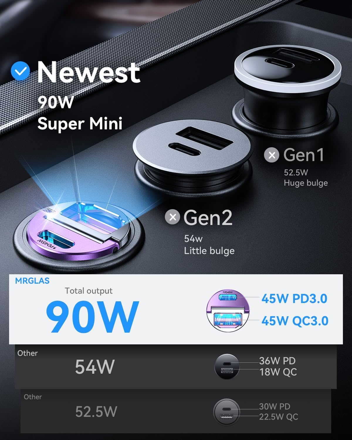 - PD45W+QC45W SUPER FAST CHARGING: MRGLAS 90W car charger adapter fast charging supporting PD 45W(usb-c port) and QC 45W(usb-a port) high output, Can fast charge all prevailing phones/iPad/tablet at the same time. Makes the IPhone 16 Pro Max and Samsung Galaxy S25 charging time from 0% to 89% in 30 minutes