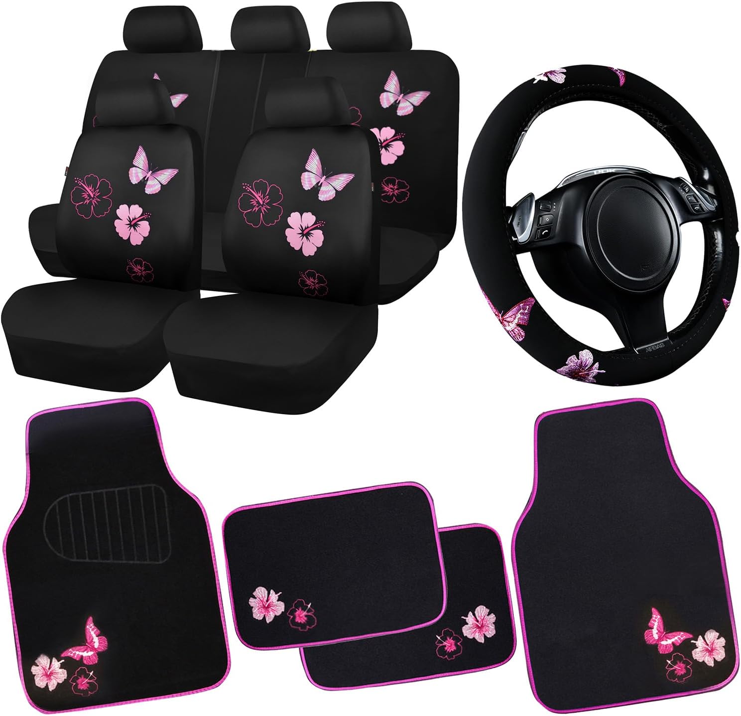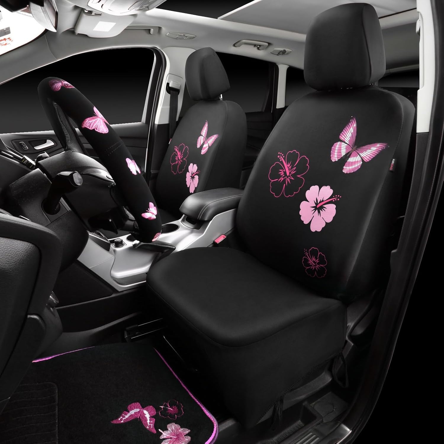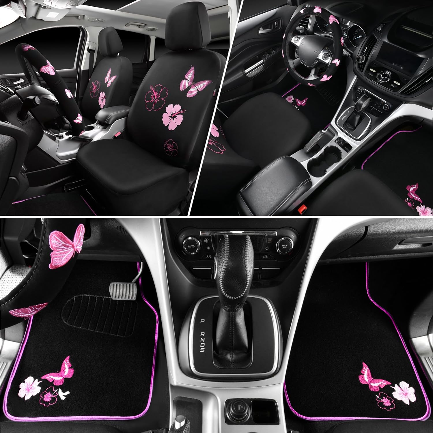 - ăComplete Car Interior AccessoriesăIncludes a full set of butterfly seat covers, 4 butterfly floor mats and a butterfly steering wheel cover to give your car a new look.