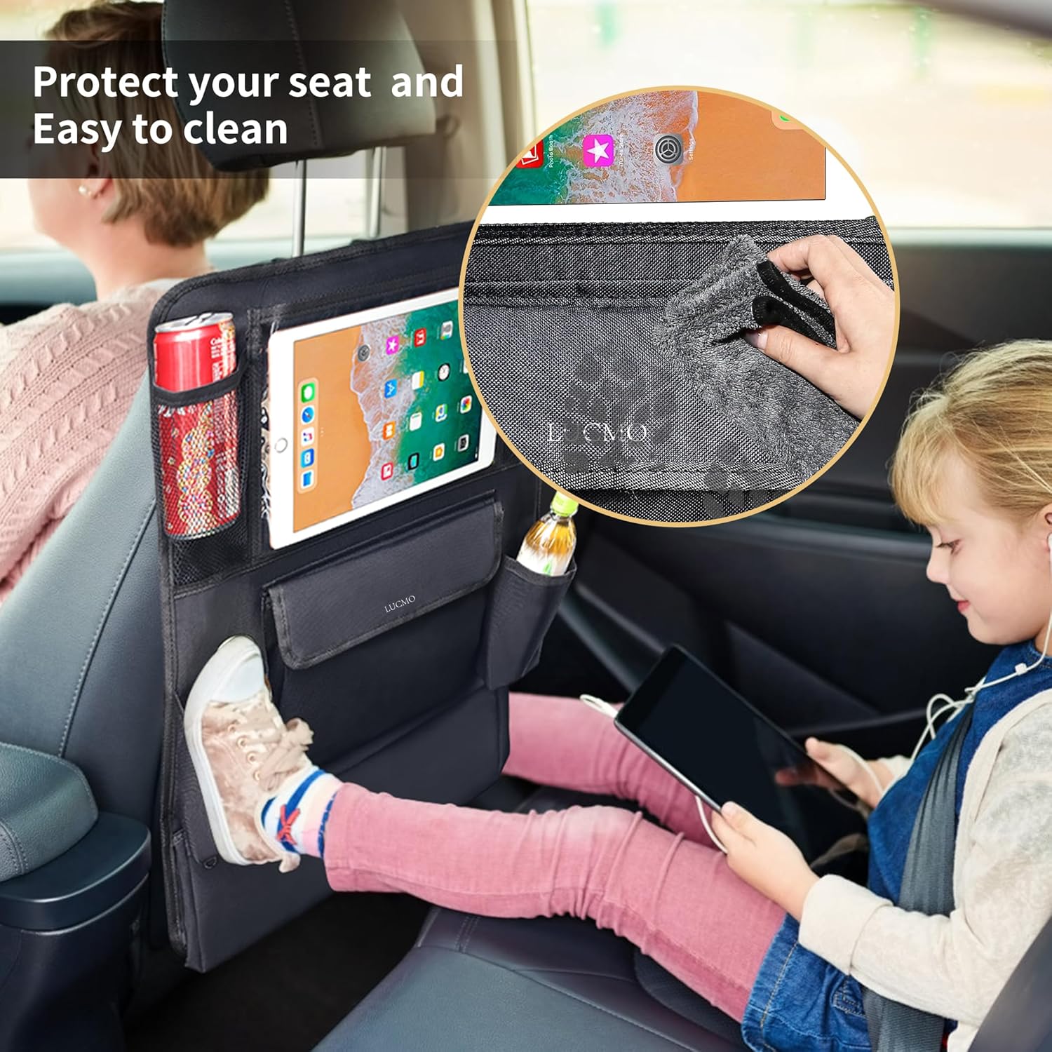LUCMO Car Backseat Organizer with Touch Screen Tablet Holder,9 Storage Pockets Protectors Kick Mats Travel Accessories for Kids-Black