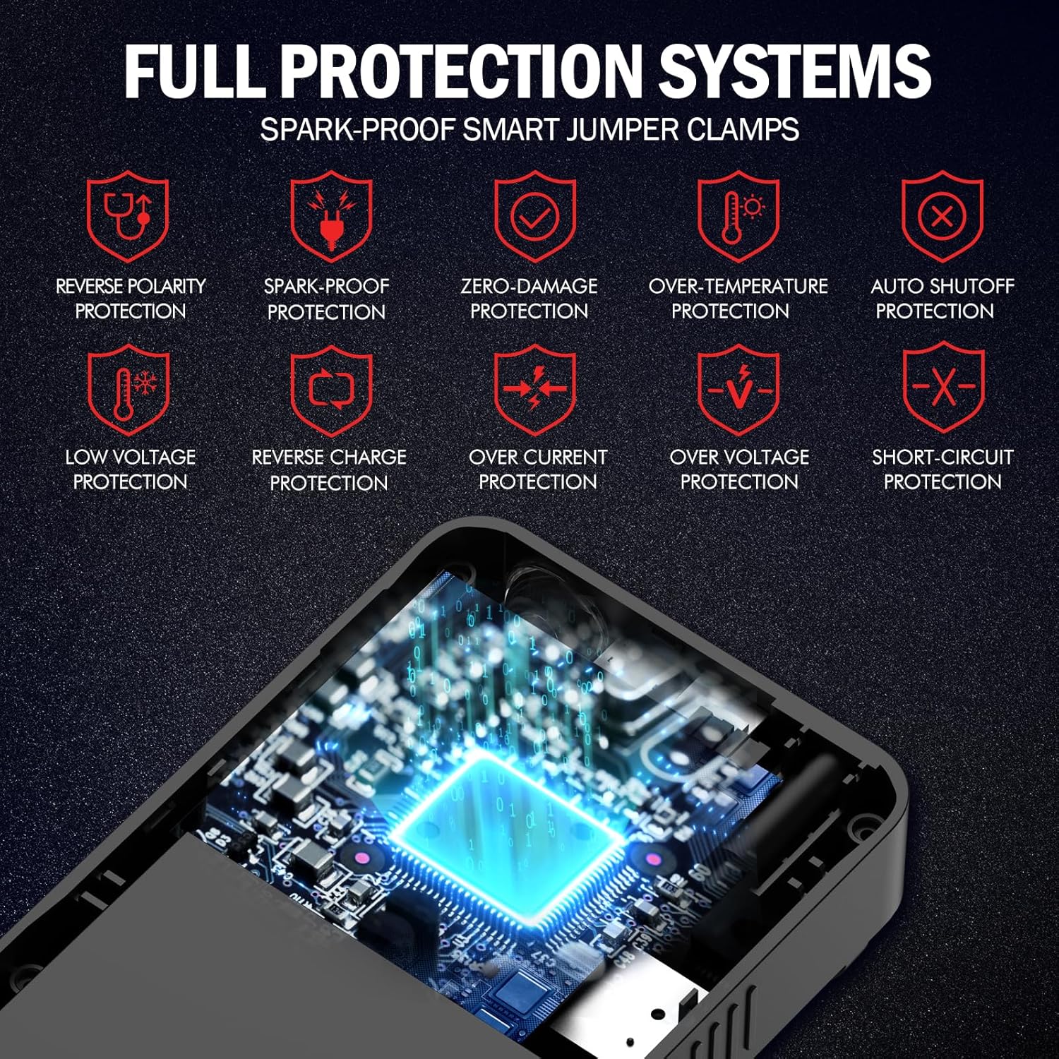 - ă SAFETY PROTECTION SYSTEM ă This portable car jump starter is very safe and easy to use. The all-metal jumper clamps are designed to be sturdy and durable, it provides versatile protection systems including low/high voltage, over-temperature, short-circuit, reverse polarity and jump starter time out protection, without the worry of incorrect connections or sparks. The excellent conductivity and durability can start your battery quickly and safely, even in extreme temperatures (-4°F~140°F).
