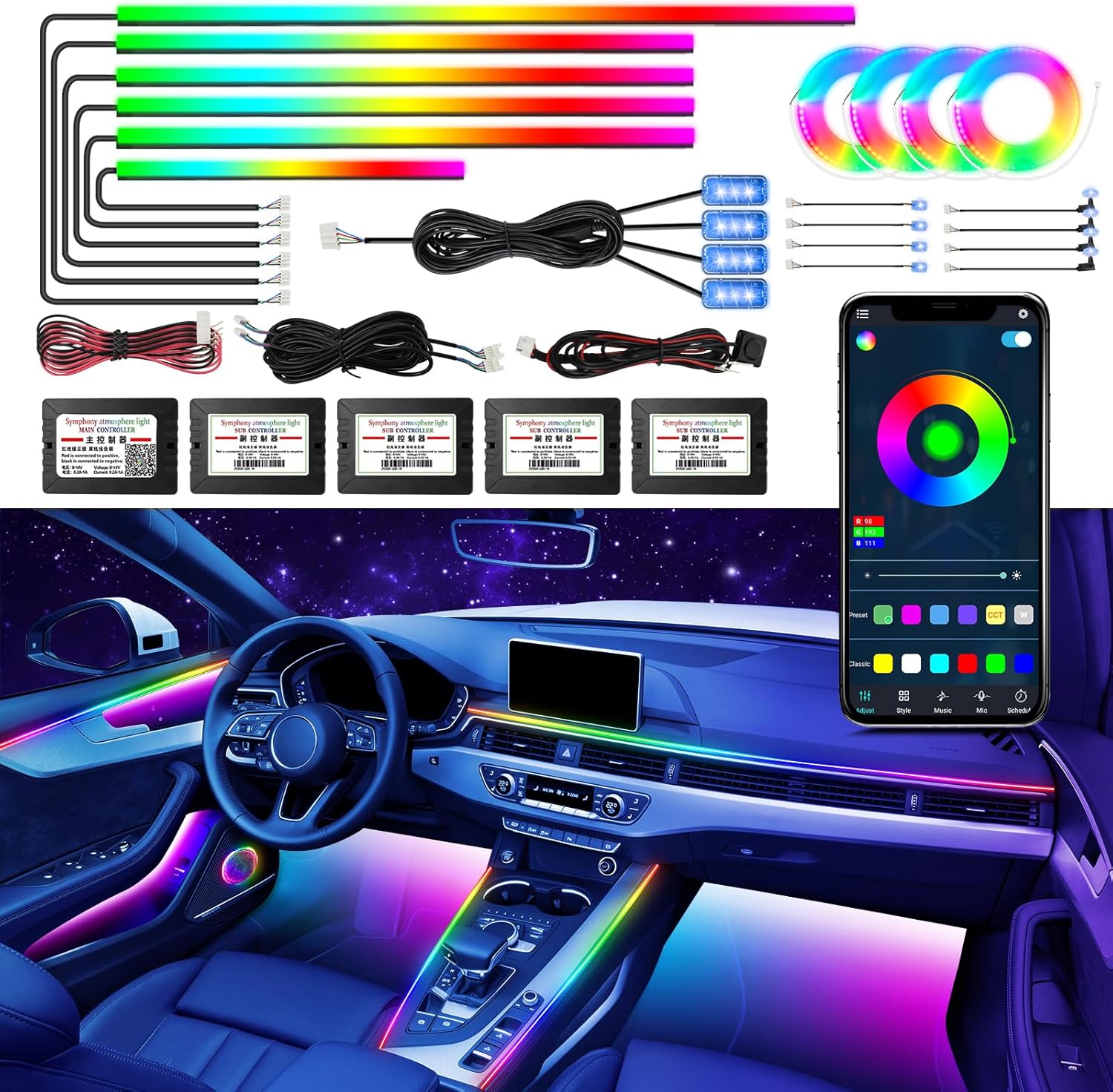 - ă Dreamcolor Car Ambient Lightă This interior car LED light consists of 6 acrylic fiber optic light strips (1*14inch+4*29inch+1*43inch, with 593 LEDs), 4 under dash lights, 4 door handle light, 4 door storage box light, 4 woofer lights, one master controller and 4 slave controller, which can be flexibly installed in any car. The dreamcolor lighting effect of the upgraded can bring you a different experience.