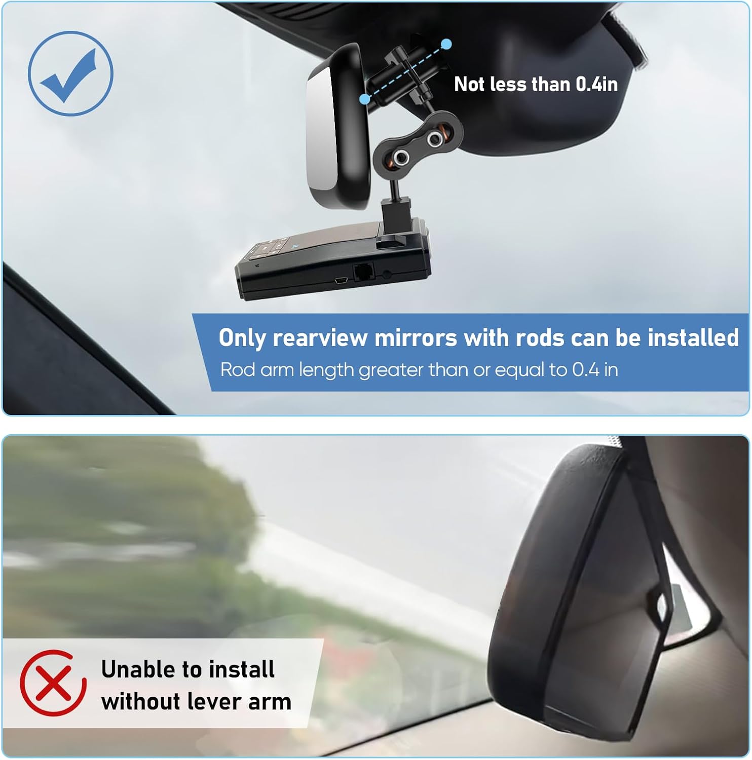 - EASY TO INSTALL device can be completed within a few minutes,please ensure that the length of the rearview mirror lever arm is greater than or equal to 0.4 inches.The bracket handle is equipped with a 1/4 screw adapter interface,which can be extended to different devices