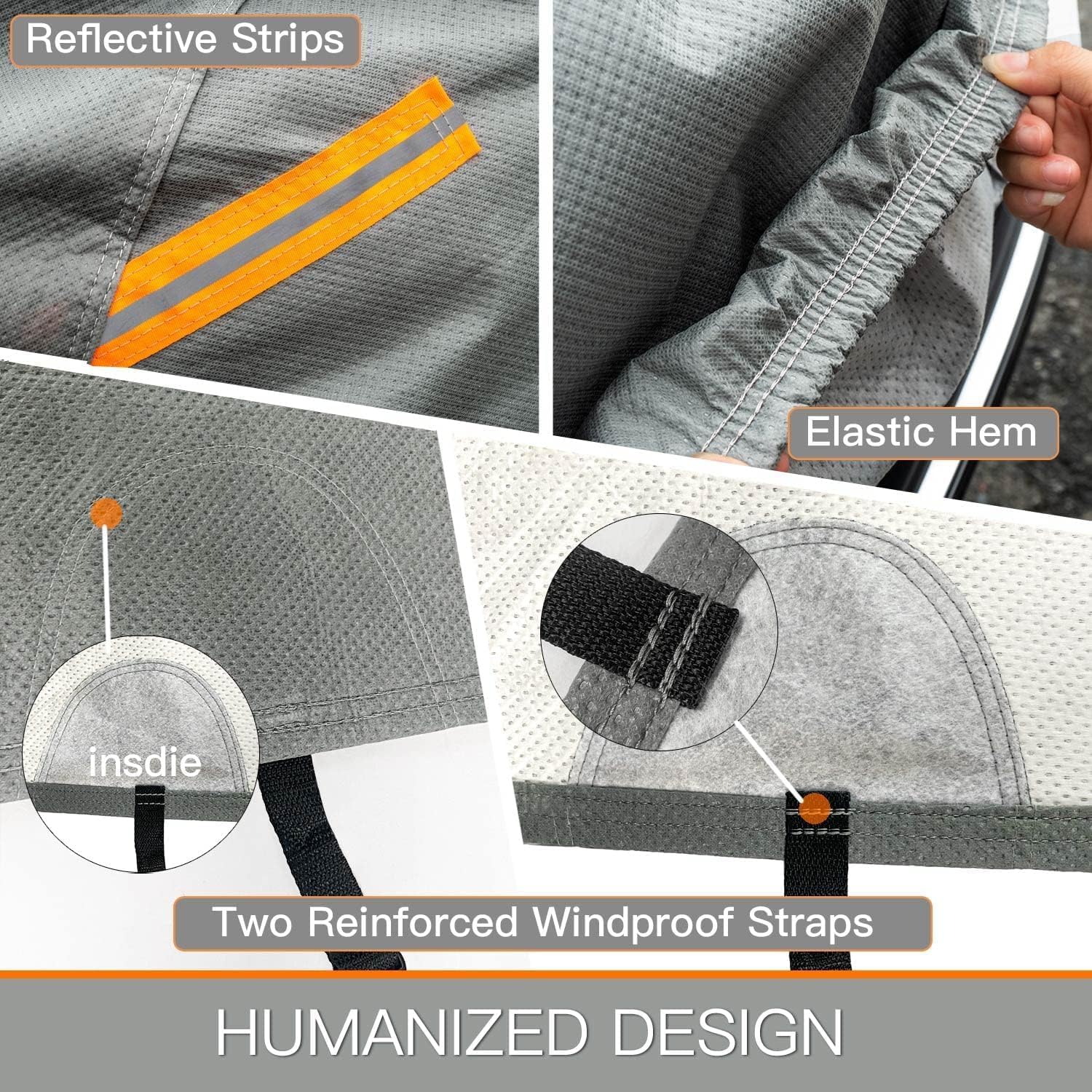 - ăUnique Designă-1 driver's door zipper for easy access. 2 The front and rear wind belts can fix the car cover in strong wind. 3 6 transverse orange reflective strips to remind others at night. 4 mirror pockets make the lid fit better. 5 The elastic hem at the bottom makes the car cover fit the car better.
