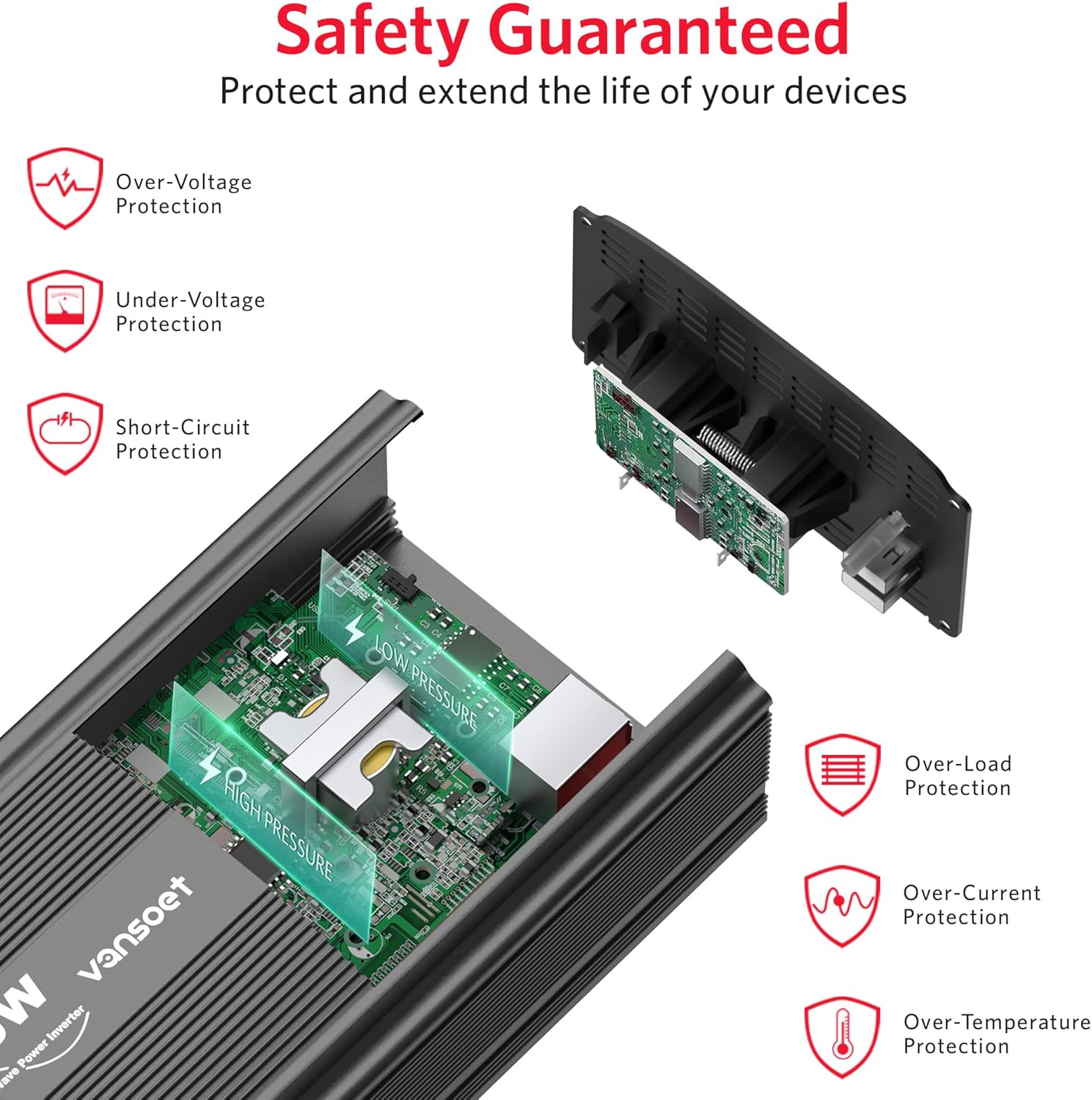 - Isolated Voltage Protection: With isolation voltage protection, offering comprehensive safeguards against over-voltage, under-voltage, overheating, overloading, reverse polarity, and short circuits. Importantly, it prevents excessive battery drain due to under-voltage protection. Automatically sensing overload conditions, the inverter halts AC power output when the load exceeds 500W, requiring power off/on to reset the overload condition, indicated by a flashing red light.