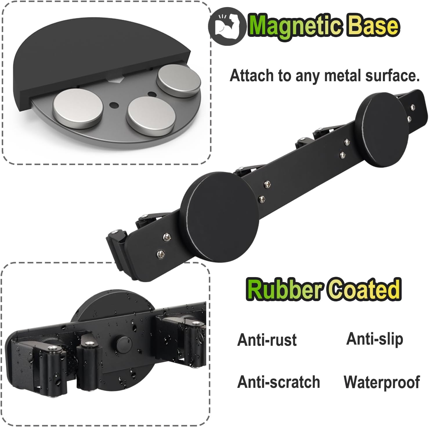 - 【Magnetic Mop Broom Holder】The magnetic wall mount broom holder designed with 2 powerful magnet bases. It's easily attach to any metal surface without installation tools. Help you organize mops, brooms, garden tools and keep your home tidy and cleaning
