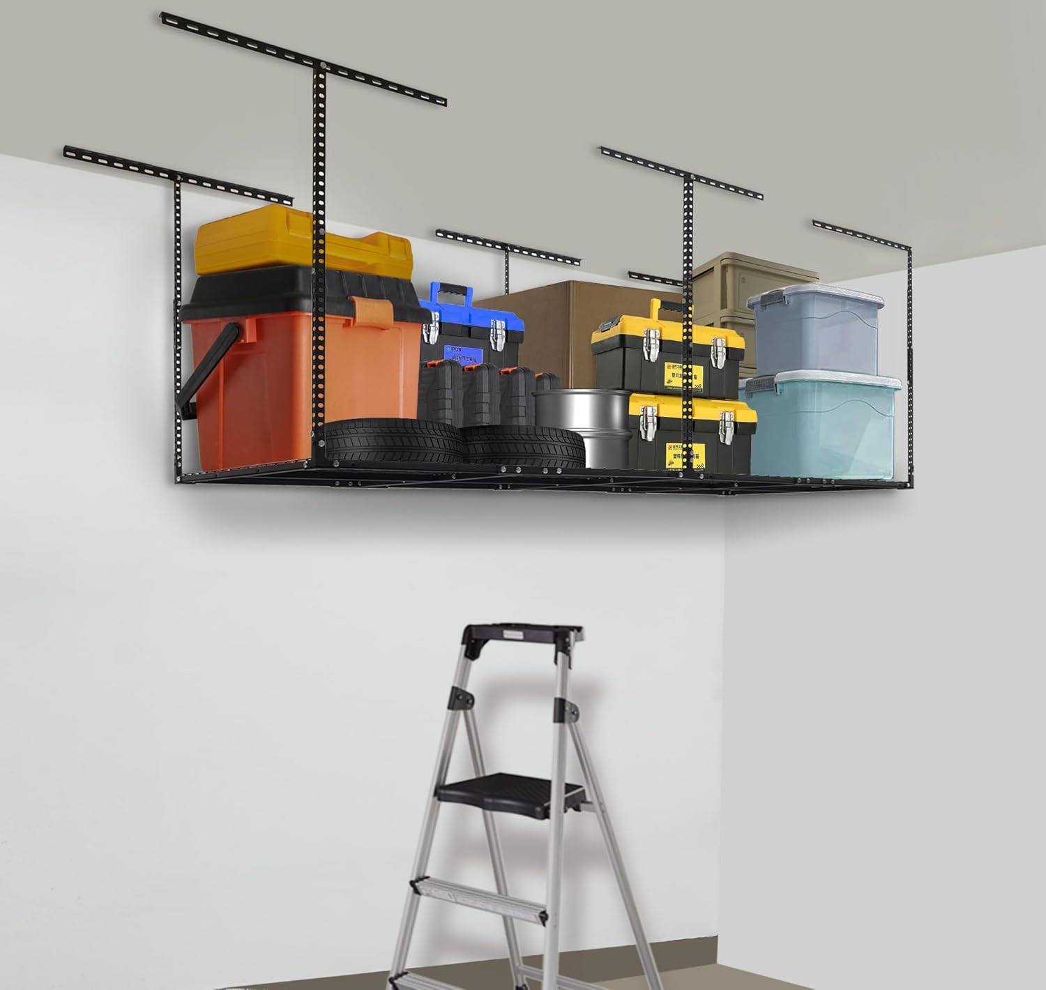 - HIGH QUALITY: Garage ceiling storage racks can hold up to 600 pounds and are perfect for storing bikes, lockers, sports equipment, holiday decorations, and more. The powder-coated finish is waterproof.