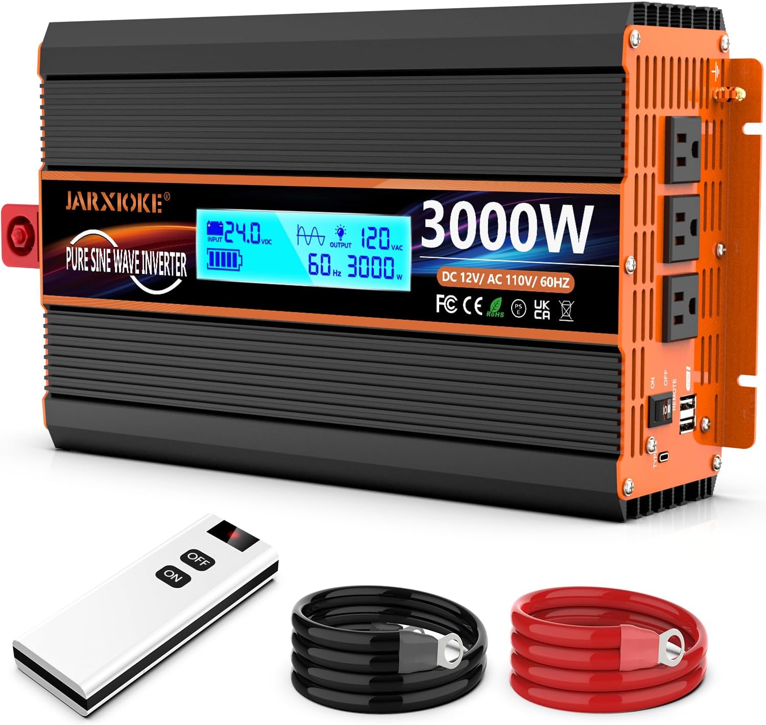 - ☀ [Advanced Pure Sine Wave] JARXIOKE inverter provides true 3000W continuous power and 6000W peak power. 24V to 110/120VAC pure sine wave technology saves more energy with high conversion efficiency (>90%) and low no-load losses.