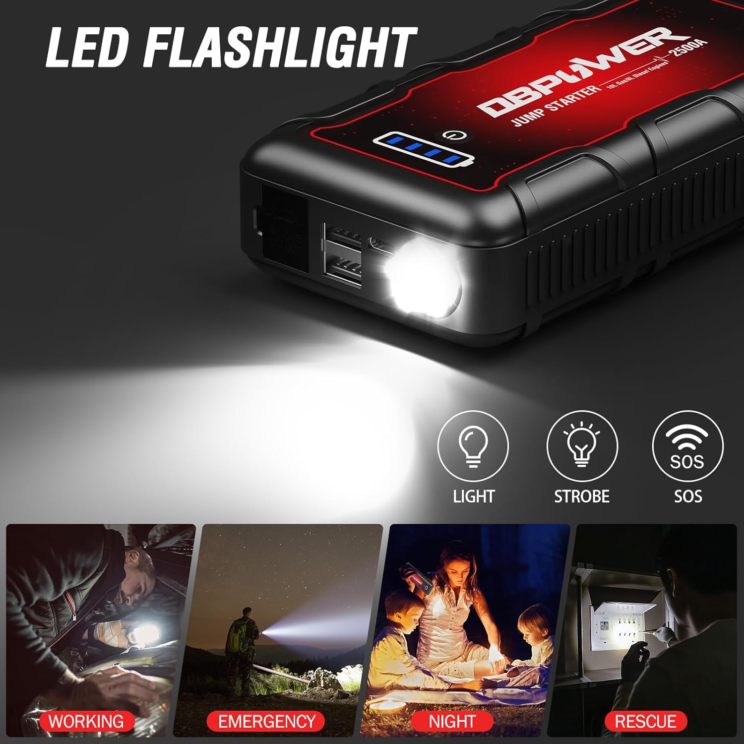 - ă 2500A JUMP STARTER ă The DBPOWER G57 car jump starter provides up to 2500A peak current, it can start up to 10L gasoline engines and 8L diesel engines in just a few seconds. This lithium battery booster designed with heavy-duty clamps and cables, can quickly jump start all 12V dead car battery for up to 60 jump starts on a single charge. It is suitable for cars, trucks, motorcycles, boats, RVs, tractors, and more. You can easily and quickly solve problems by yourselfïŒ