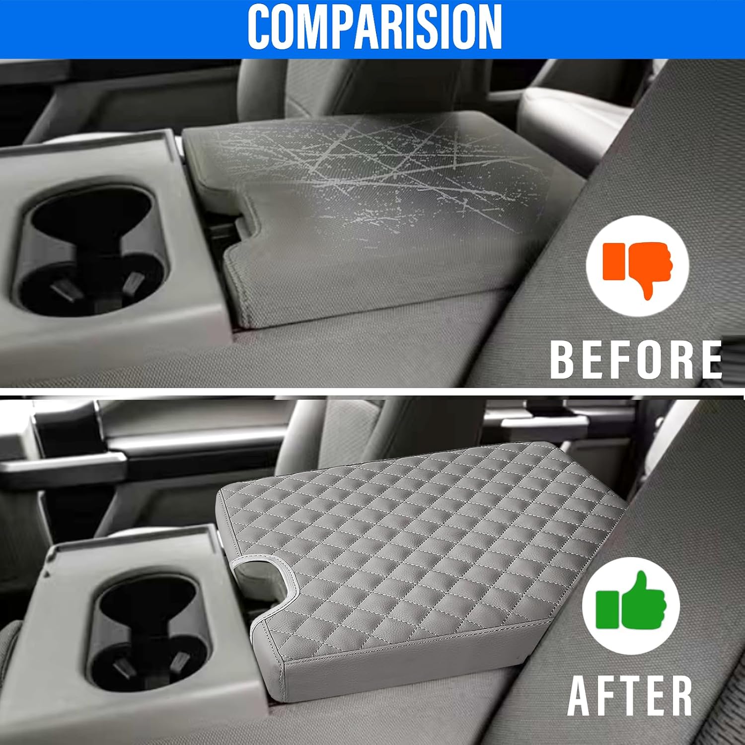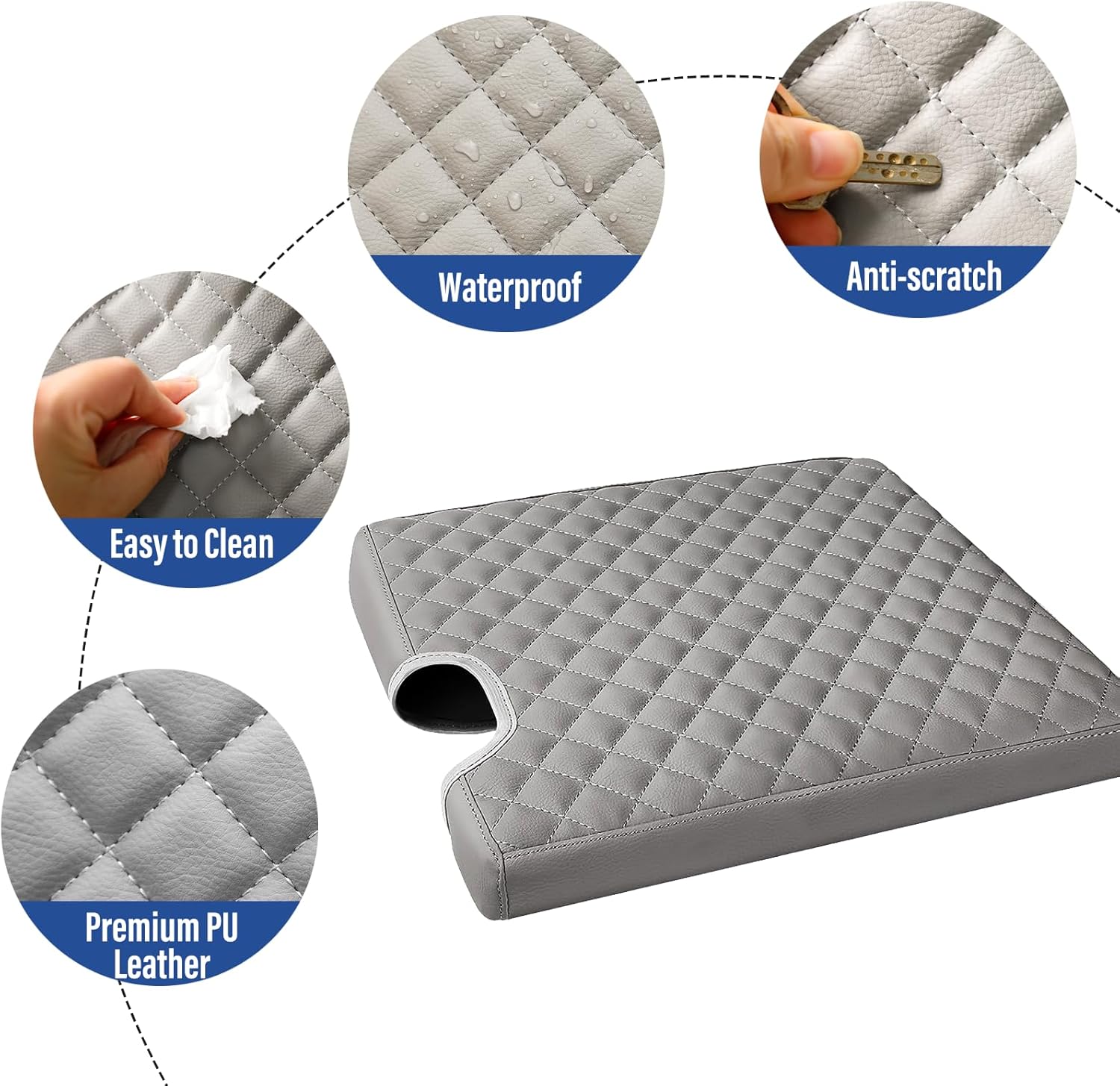 - FULL PROTECTION - This jump seat console cover is made of premium scratch-resistant artificial leather, protecting your center console lid from pets' claws, fingernails, key scratching, abrasion, dirty liquids, or dust. In the meantime, this armrest cover hides an already damaged center console so that you don’t have to replace the original console