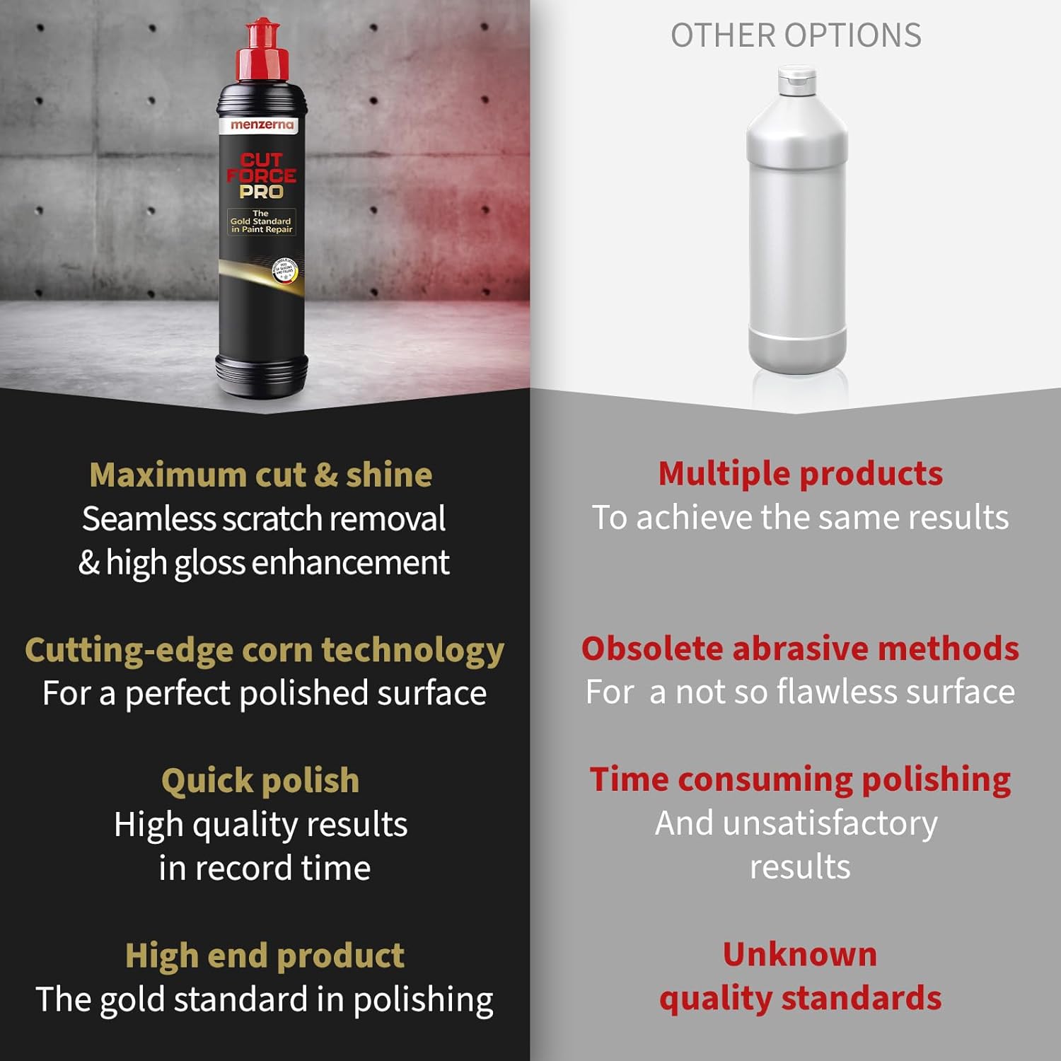 - 2 STEPS IN 1 FOR INCREDIBLE RESULTS: Cut Force Pro ensures maximum removal while maintaining excellent gloss. An absolute innovation from the Menzerna premium laboratory. It gets the job done without the hassle to switch between different products. Ideal for reconditioning used vehicles!