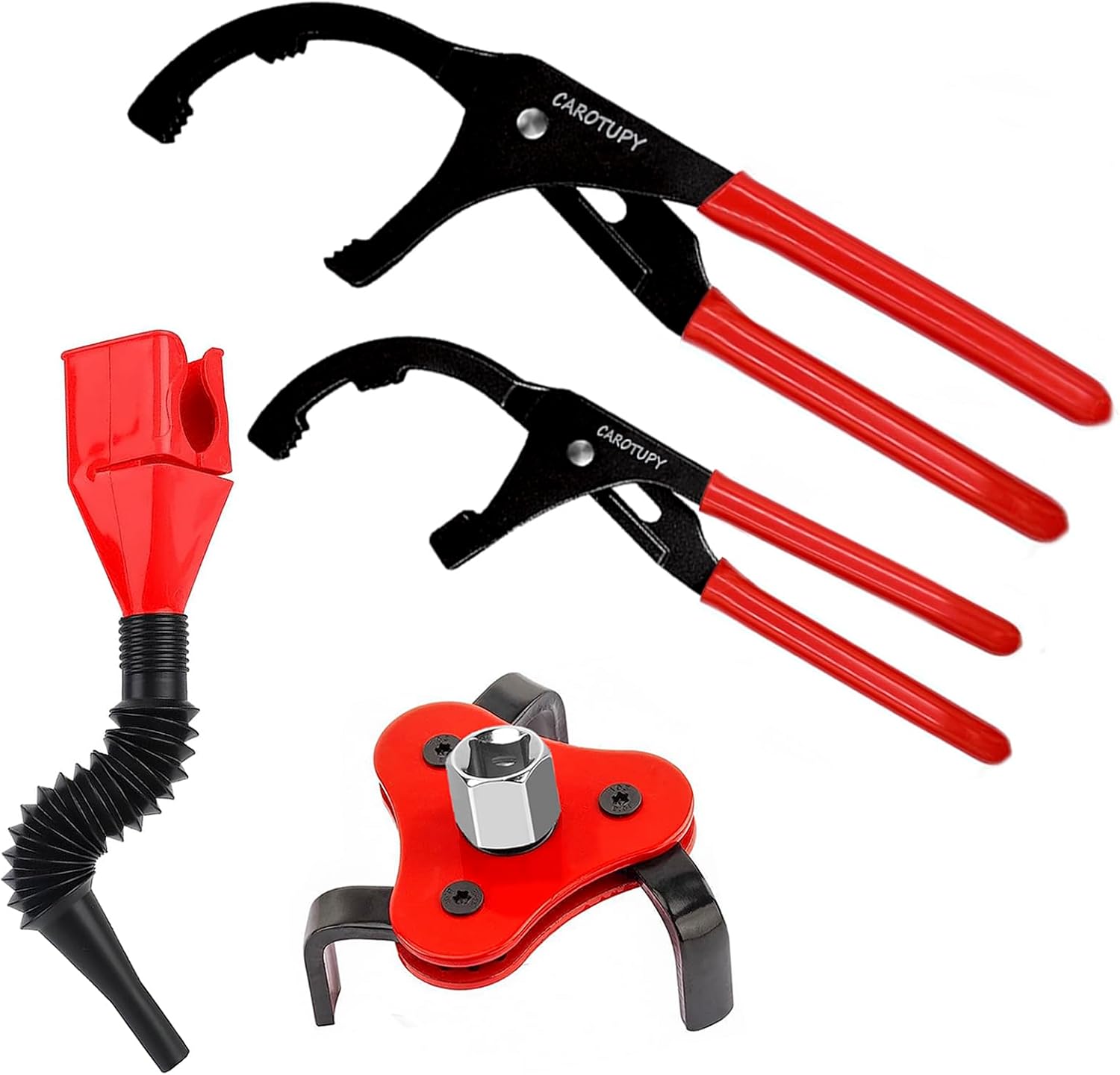 - Oil Filter Pliers Set: This wrench set include 2 pack oil filter pliers and 1 pack oil filter wrench and 1 pack flexible oil funnel, the tools set satisfy your daily demands and meet your work needs for maintenance of oil filters and oil change, suitable for most cars, trucks and motorcycles.