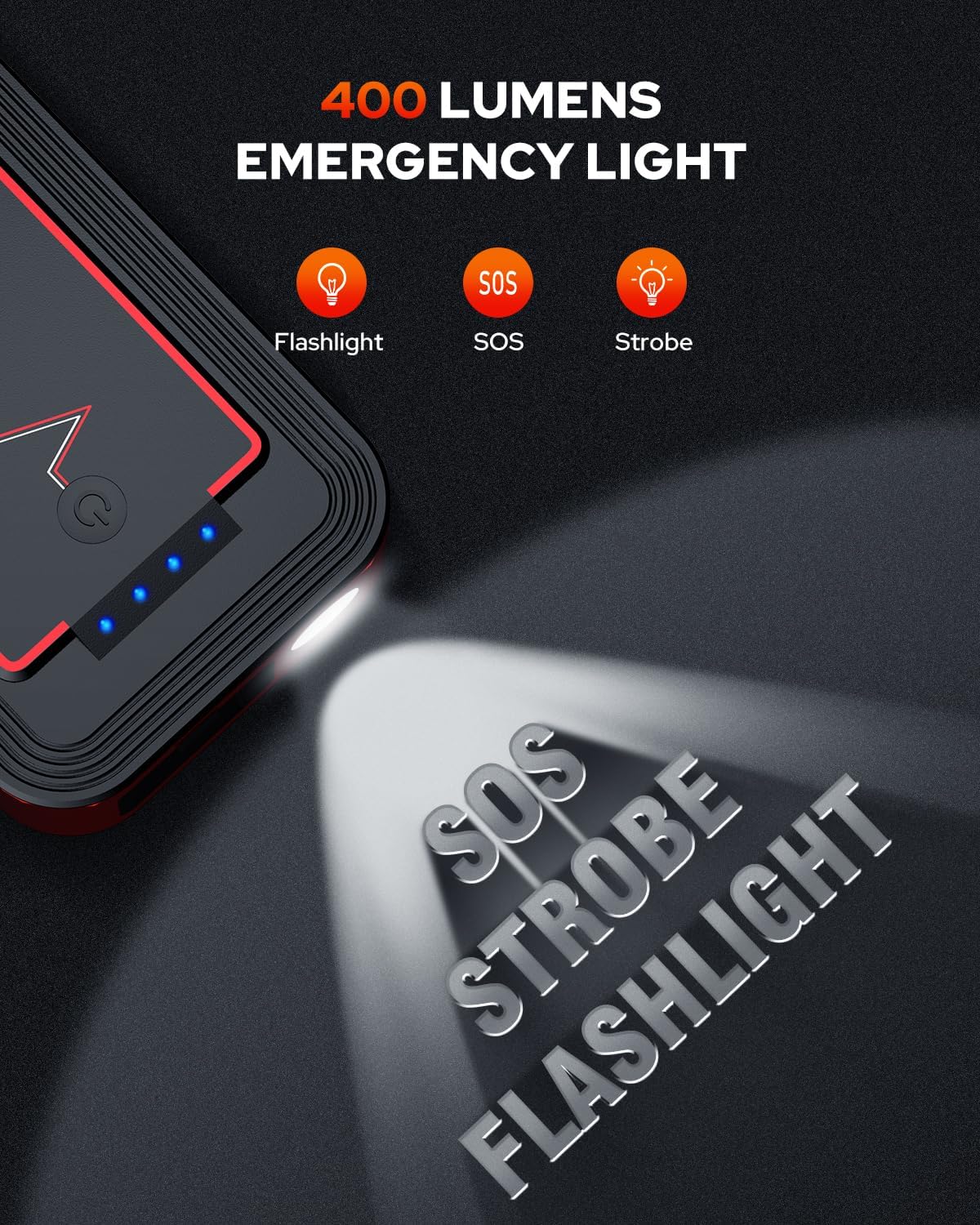- âś…ALL IN ONE jump starter - This jump start battery pack integrates 4 practical functions to meet all your needs, including car emergency starting, 400-lumen LED lighting(stable, strobe, and SOS), Power bank 20000mAh with QC3.0 fast charging, and 12-16V/6A DC port to power your 12V vehicle-mounted devices. while it's only weights 1.2pounds, Say goodbye to old bulky jump start battery pack NOW!