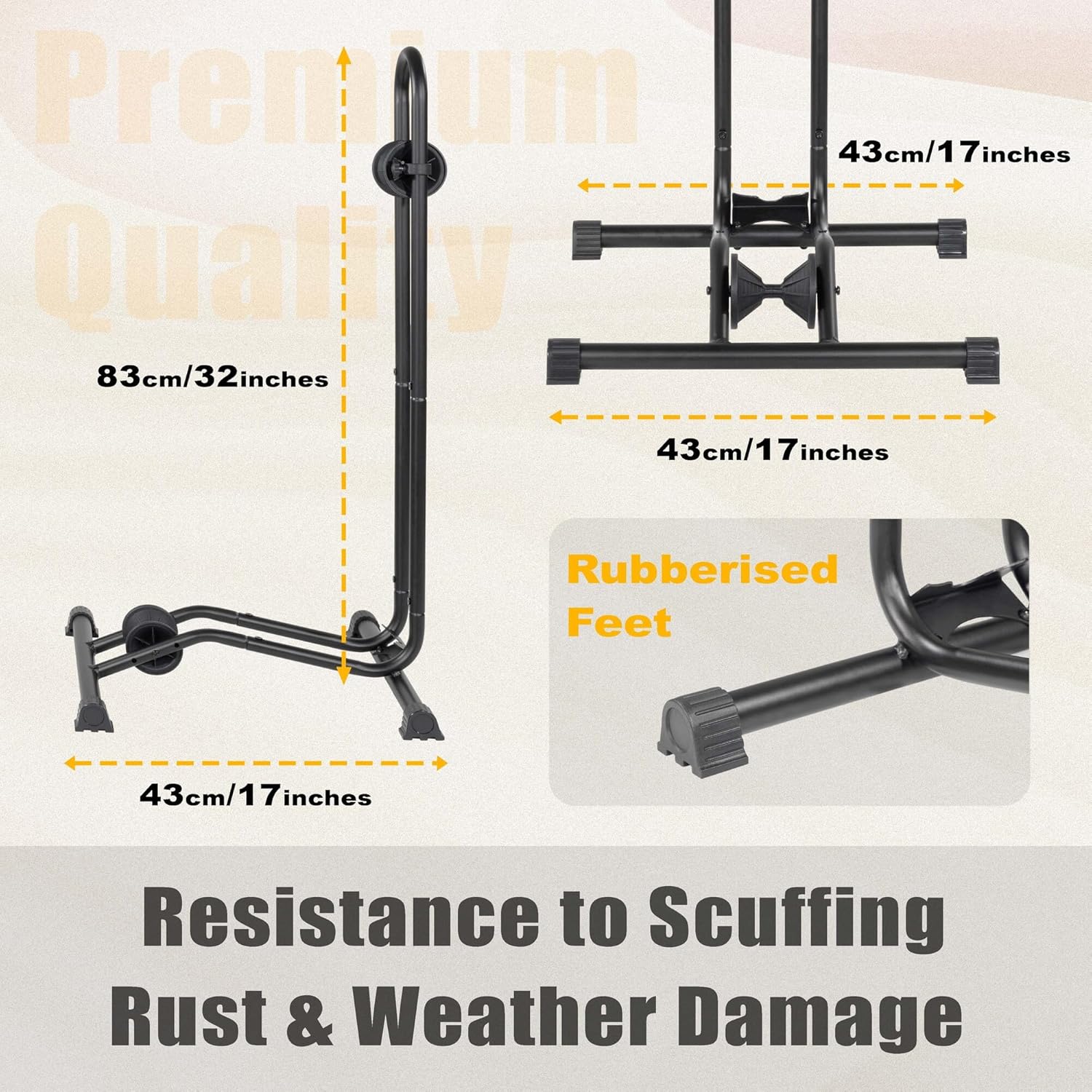 - PREMIUM DURABILITY - Crafted from powder-coated, high-quality solid steel with anti-rust coating, our bike floor stand ensures durability and stability. It resists scuffing, rust, and weather damage, ensuring a long lifespan. The rubber-protected base and precision-machined joints further enhance its stability, making it perfect for indoor use. This bike floor stand weighs 1.96 kg/4.35 lbs, providing a reliable and long-lasting solution to keep your bike safe and accessible.