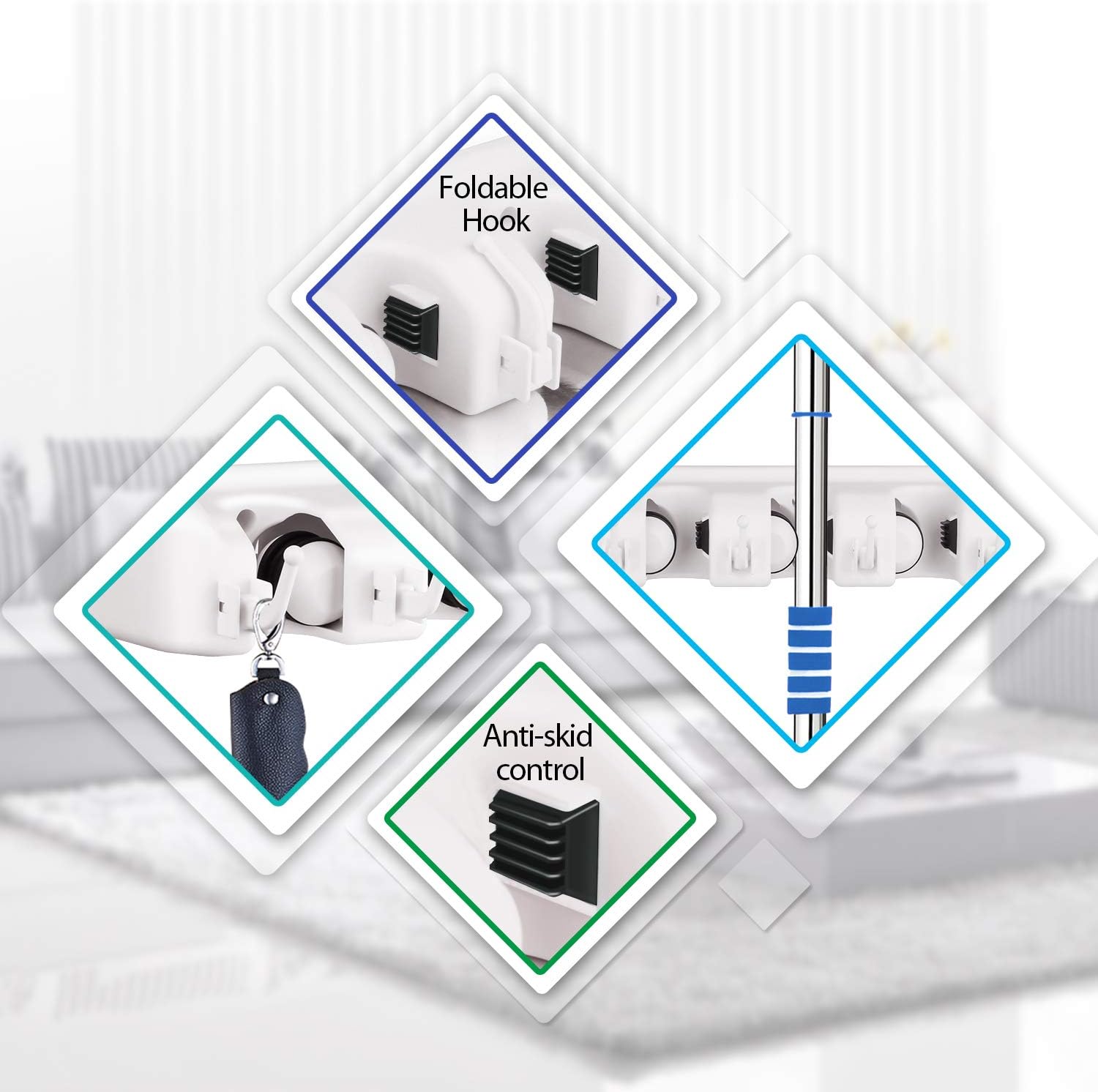 - Heavy Duty & Tough& Reliable Broom Hanger - Mop holder wall mount grip everything tightly and securely. Foldable and extremely sturdy hooks with unique hook edge design, easy to hang on, no slip or fall off, this broom rack is sturdy enough to hold up to 40lbs, each hook of our mop hanger can bear 6lb at least.