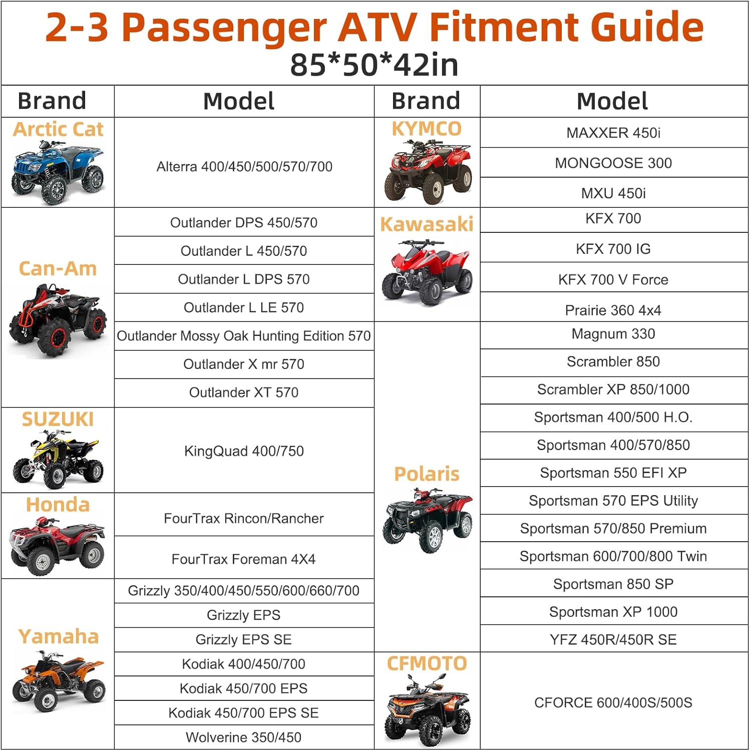 - ăUniversal four wheeler Modelsă:The cover size - 85" L x 50"W x 42" H fit for most ATV, suit for Arctic Cat, Can-am, Cfmoto, Honda, Kymco, Polaris, Suzuki, Yamaha ATV and more(To ensure the right size, please measure your ATV before purchasing)