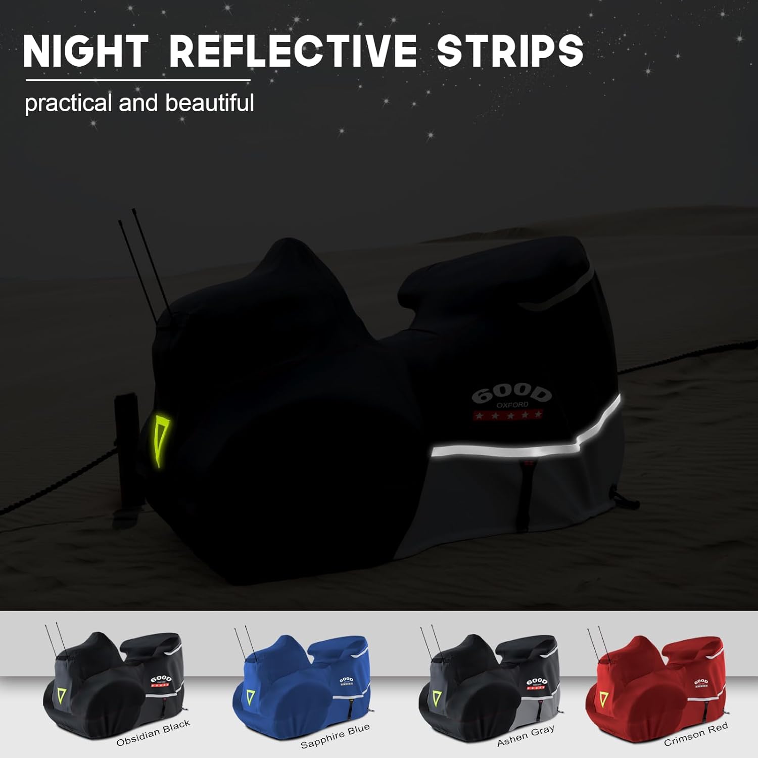 - đ”ă100% 600D Oxford clothă: The trike cover, weighing 9.5lb, is almost thicker and solider than those on the market. The fabric is resistant to aging and ripping, and UV proof, dustproof and rainproof.