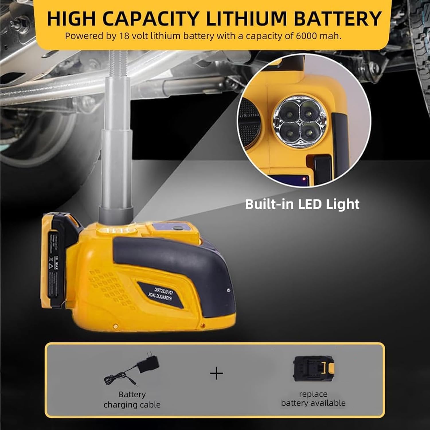 - 18V Battery Powered: Standtall electric car jack will give you a hand when you need to change a tire without looking for the power cord. This jack can be powered by an 18V lithium battery