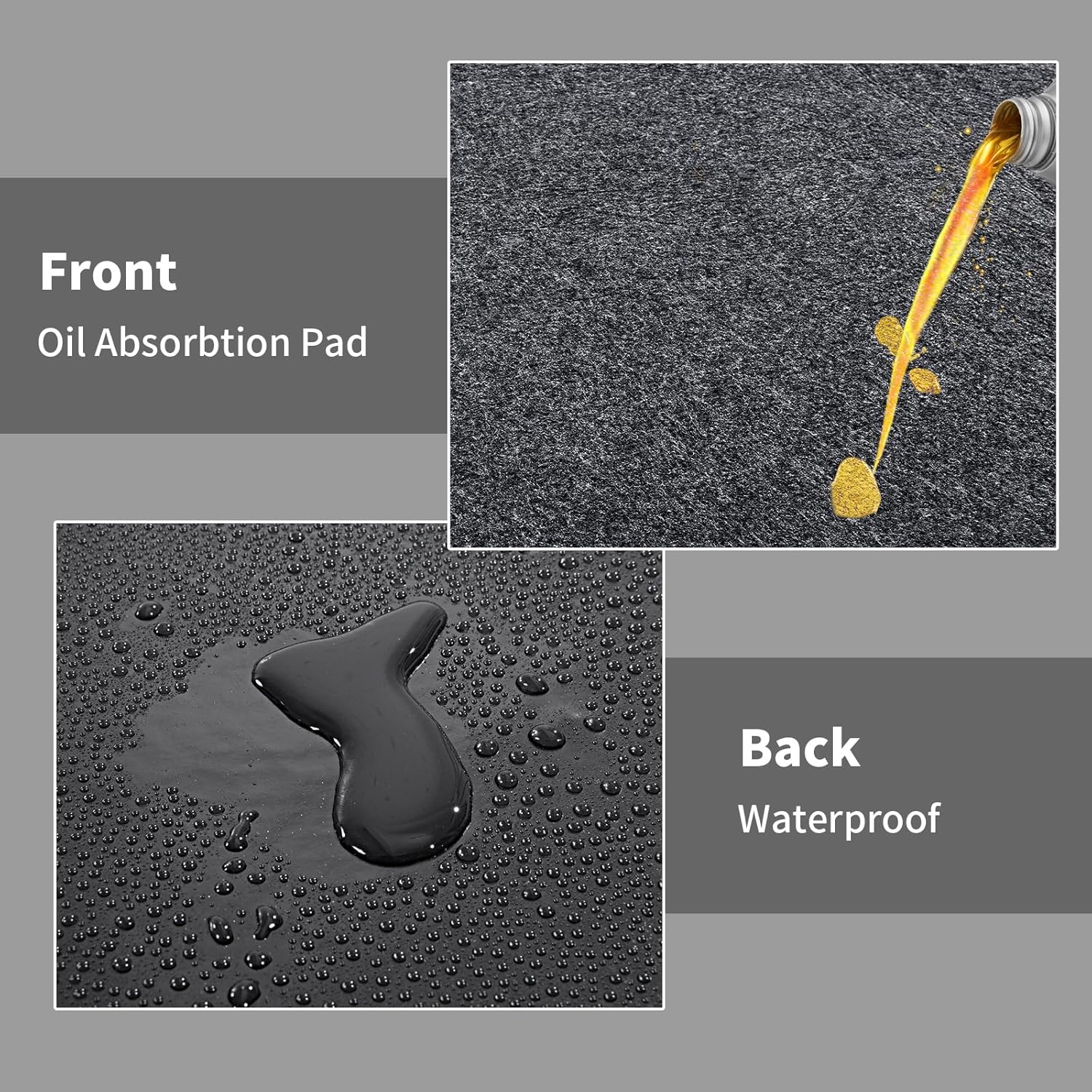 - 【PREMIUM ABSORBENT MATERIAL】:The top layer of mat is made of compact and thick fabric which is moisture-proof, absorbs oil, water, and other liquids. It can prevent the sludge and other pollutants on the car tires from overflowing, which provide excellent support and cushioning to avoid damaging the floor.
