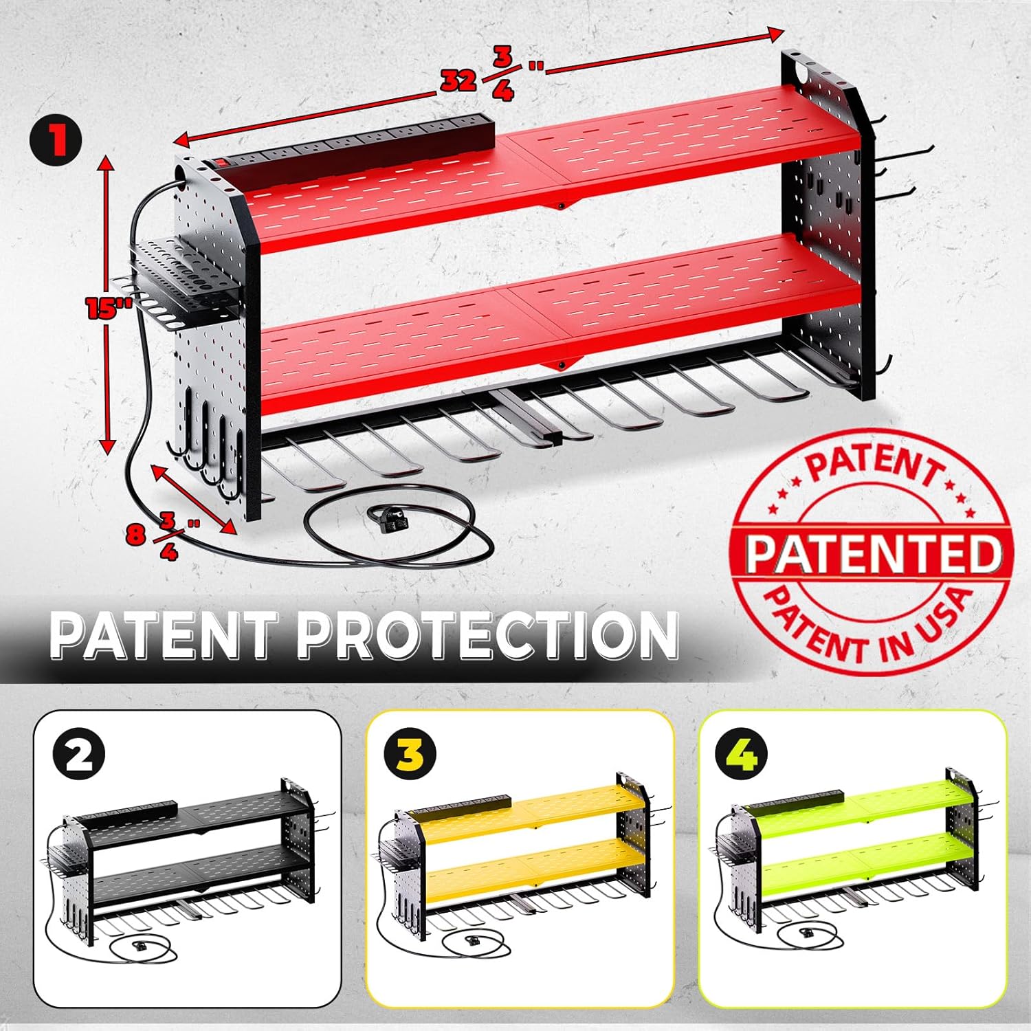 - Efficient Storage: The KAFAHOM Electric Tool Rack is designed with three tiers and eight dedicated slots to efficiently store your electric tools. The top tier features a built-in charging station, enabling direct charging while tools are stored.The power cord is 7 FT long 14AWG,and the charging station is 15A 125VAC 1875W 60Hz.