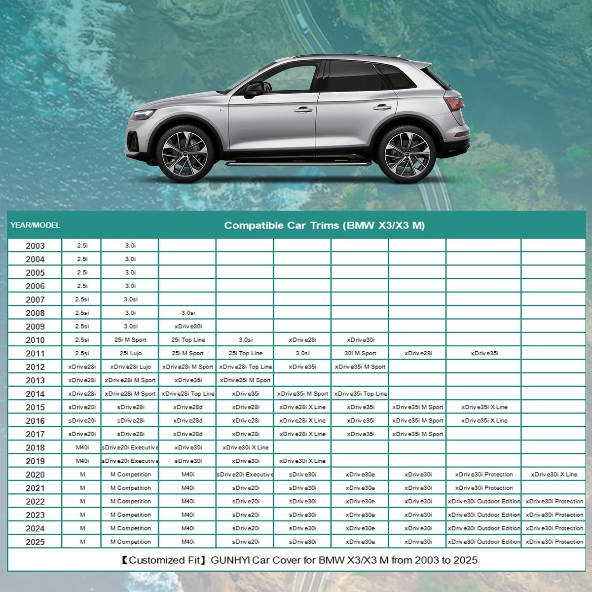 - ăCompatible withăThis Full Car Cover Custom fit for BMW X3/X3 M from 2003 to 2025. Comes with a microfiber towel that you can use to clean your car, because if there is sand on the surface of the car before use, it may damage the paint.