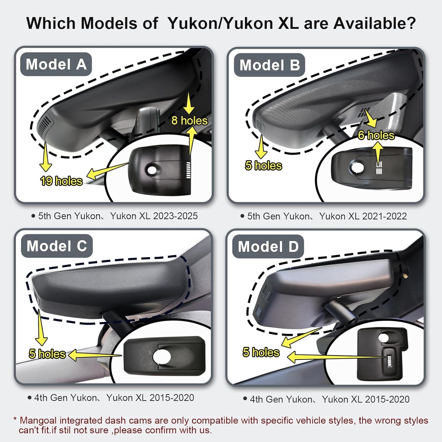 - ăCustom fit for GMC YukonăMangoal 4k dash cam can fit perfectly behind the rear view mirror like original. No messy wiring exposed, no complicated rewire at all. Perfectly intergrated with GMC Yukon, Yukon XL 2023 2024 2025 vehicle styles(Model A), Such as SLE SLT AT4 Denali Denali Ultimate.
