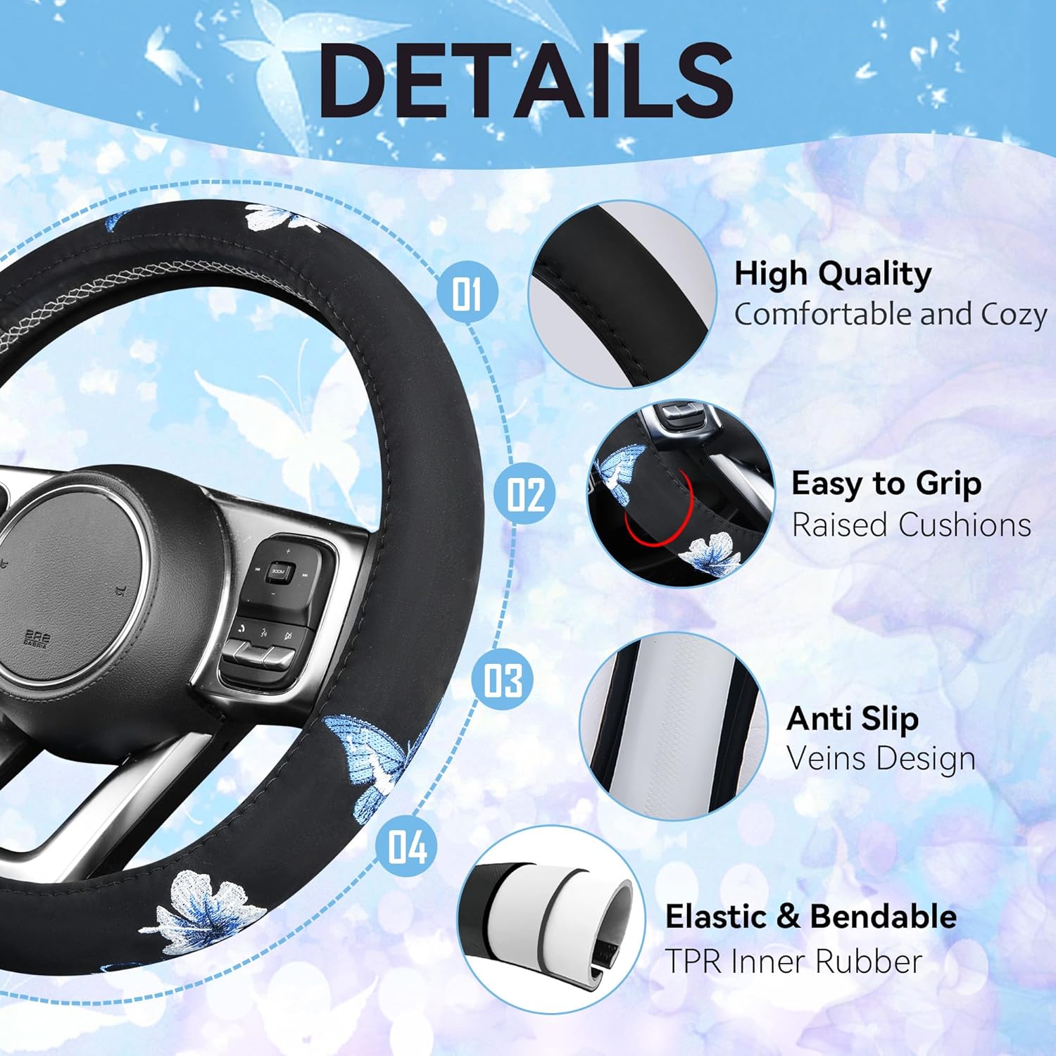 - Complete Car Interior Accessories:Includes a full set of butterfly seat covers, 4 butterfly floor mats and a embroidered butterfly steering wheel cover to give your car a new look. Airbag Compatible- We have the exclusive patent about the blast of airbag for the seat covers in case of emergence.